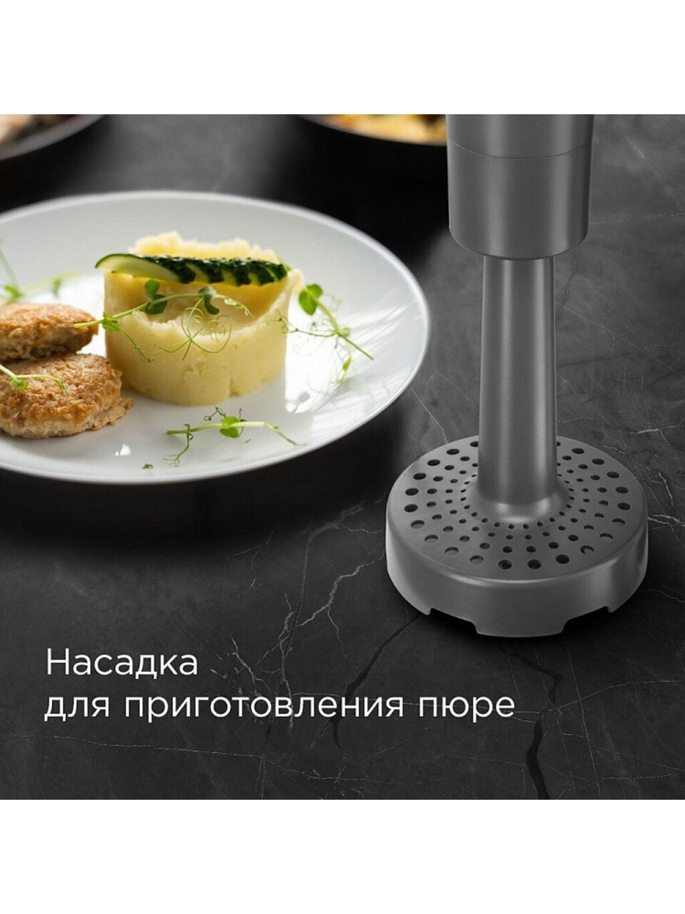 Блендер Редмонд BH400 предлагает широкий функционал благодаря разнообразным насадкам и аксессуарам. В комплект входят стакан, измельчитель, венчик и чаша, которые позволяют быстро и легко измельчать овощи и фрукты, взбивать кремы и яйца, а также готовить коктейли и соусы. Материал погружной части из нержавеющей стали обеспечивает долговечность и надежность использования, а стильный серый цвет добавит элегантности в интерьер любой кухни.