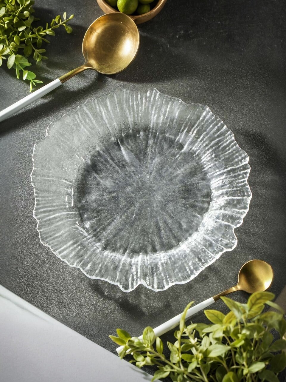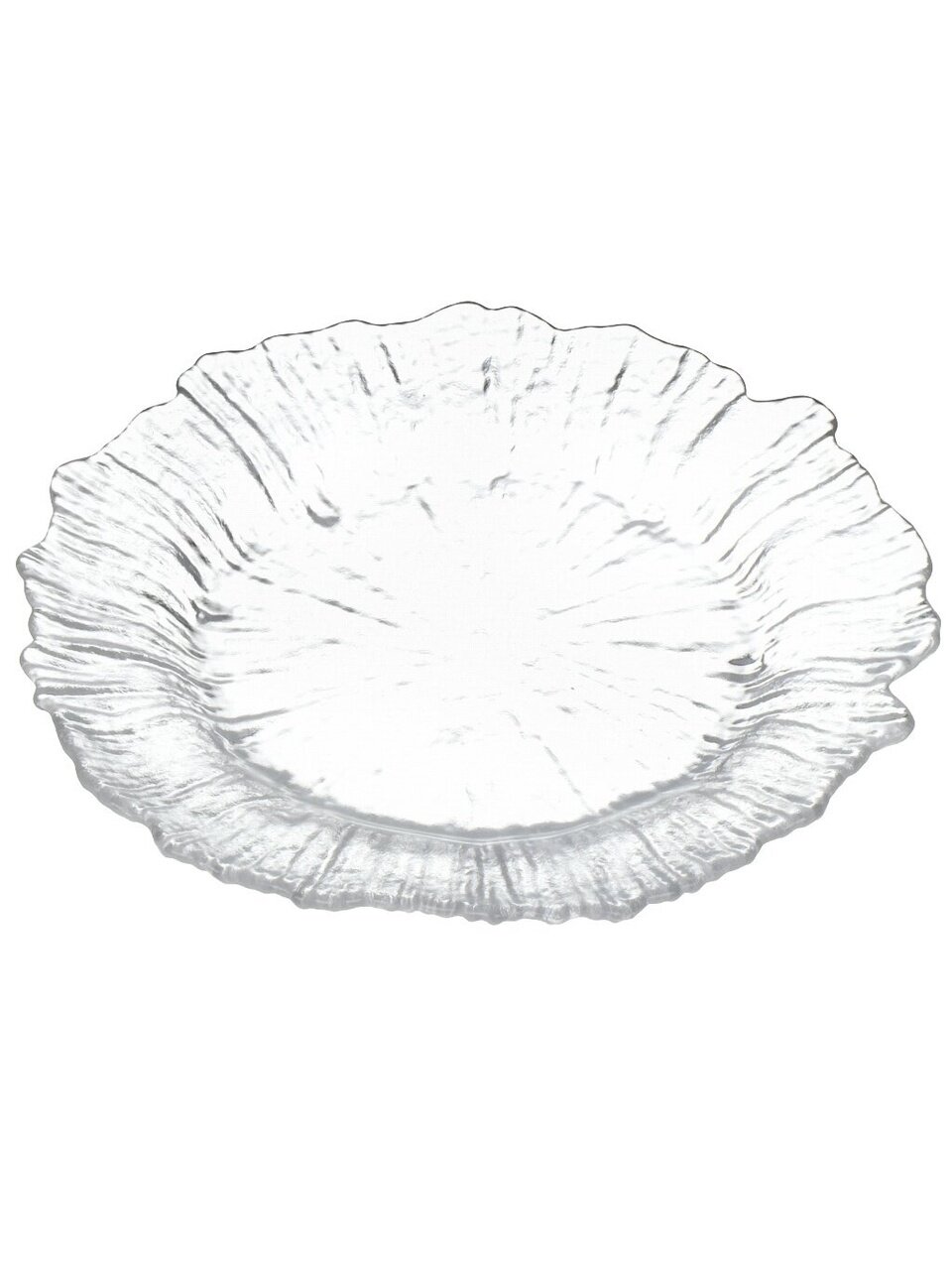 Круглое стеклянное блюдо 21 см с рельефной отделкой — стильное решение для сервировки закусок, сыра и нарезки. Безопасно для СВЧ и посудомоечных машин.