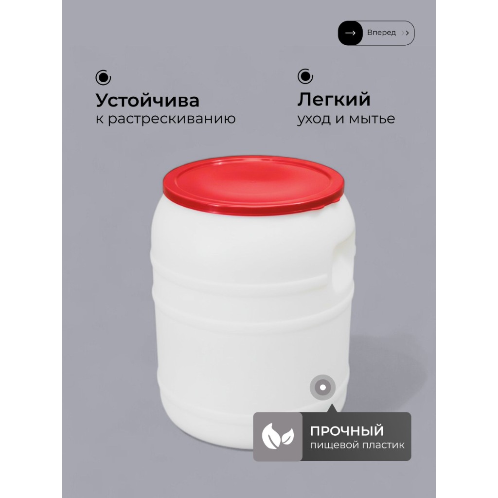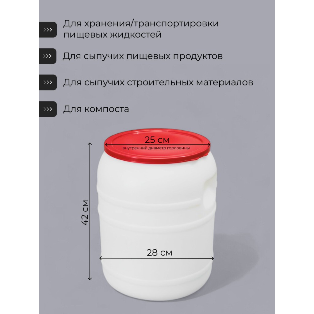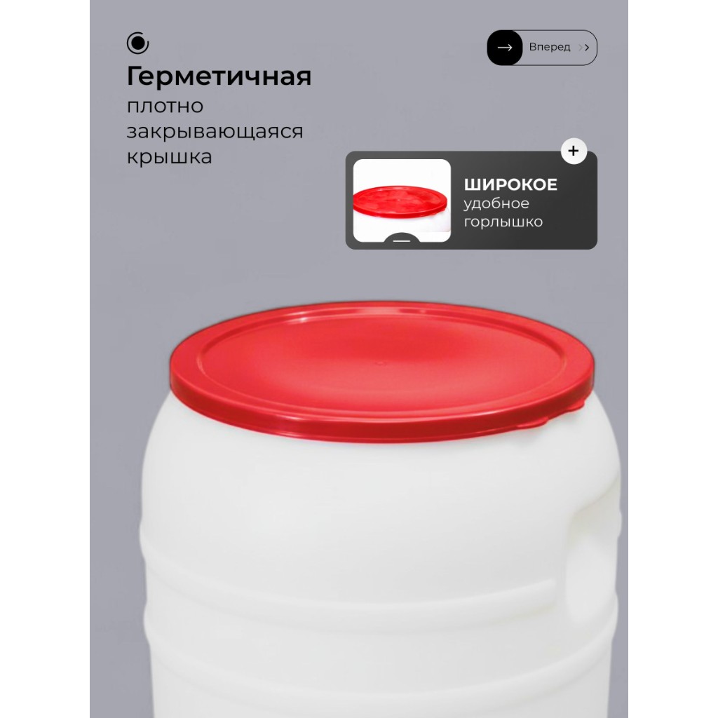Конструкция бочки с широким горлом диаметром 250 мм обеспечивает удобство в наполнении и опорожнении. Это идеальное решение для хранения больших объемов жидкостей или сыпучих продуктов, таких как мука, сахар, крупы и многое другое. Благодаря прочному материалу, бочка устойчива к механическим повреждениям, что делает ее незаменимой в условиях активного использования.