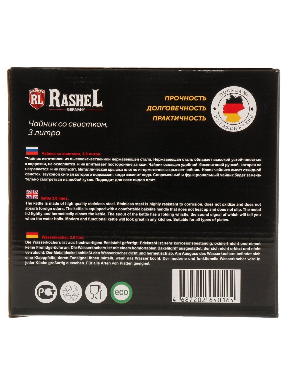 Чайник из нержавеющей стали объемом 3 литра — надежное решение для современной кухни, сочетающее стиль и функциональность. Модель RasheL М-7187 отличается лаконичным матовым покрытием и универсальным серебристым цветом, который органично впишется в любой интерьер. Благодаря прочному корпусу из нержавеющей стали чайник устойчив к коррозии и сохраняет привлекательный внешний вид даже при интенсивном использовании.