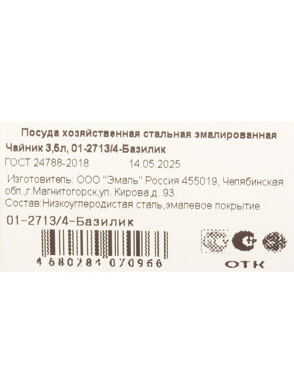 Покупка чайника сталь, эмал, 3.5 л, ручк металл, Базилик, индукц, 01-2713/4М — это инвестиция в комфорт и уют на кухне. Благодаря большому объему и универсальности, он идеально подходит для приготовления чая, кофе и других горячих напитков для всей семьи. Привлекательный внешний вид и надежность делают его отличным подарком для близких и друзей, заботящихся о качестве и стиле в доме. Выгода от приобретения заключается в долговечности, простоте ухода и универсальности использования, что позволяет наслаждаться любимыми напитками в любое время года.