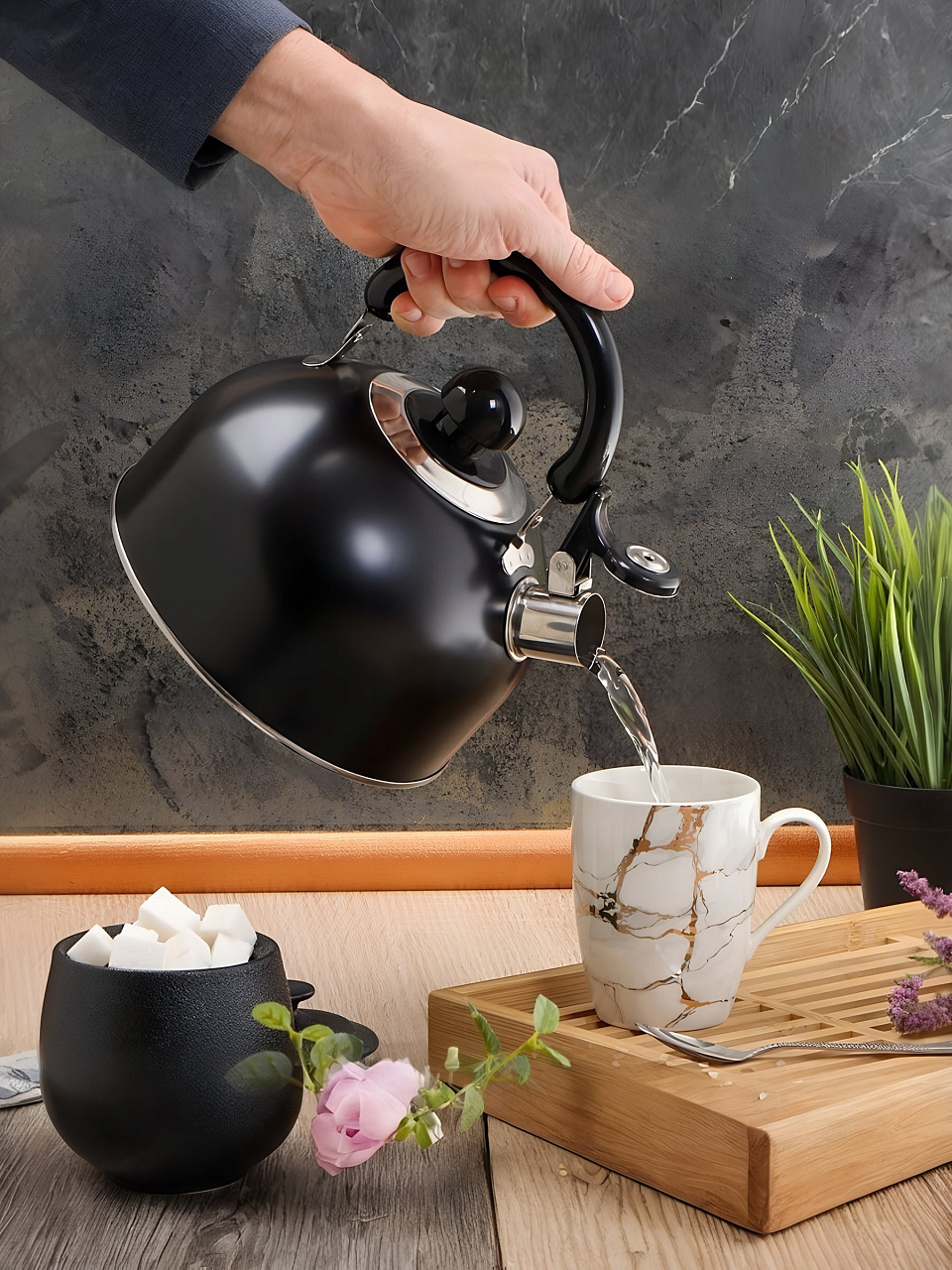 Универсальный объём 2.5 л, прочный матовый корпус, металлическая ручка и минималистичный дизайн делают чайник практичным для ежедневного использования и отличным подарком для любой кухни.