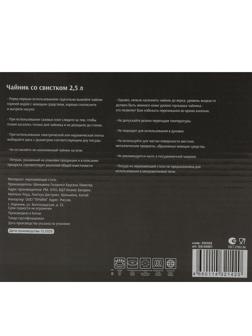 Вы можете приобрести «Чайник нержавеющая сталь, 2.5 л, со свистком, матовый, ручка металлическая, Daniks, индукция, черный, GS-04001» и другие товары в нашем интернет-магазине в Воронеже по низким ценам и с бесплатным самовывозом.