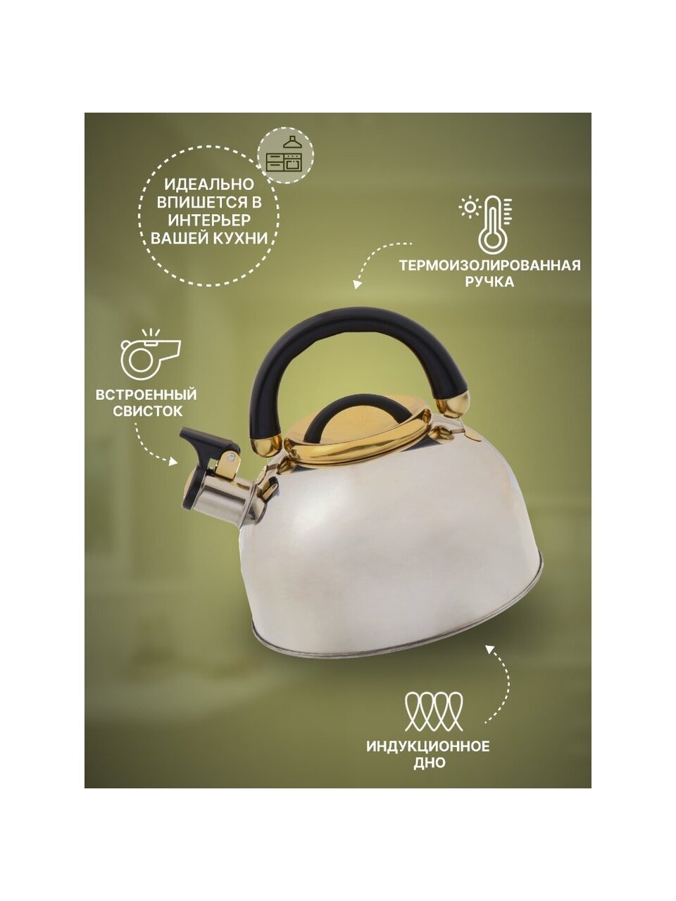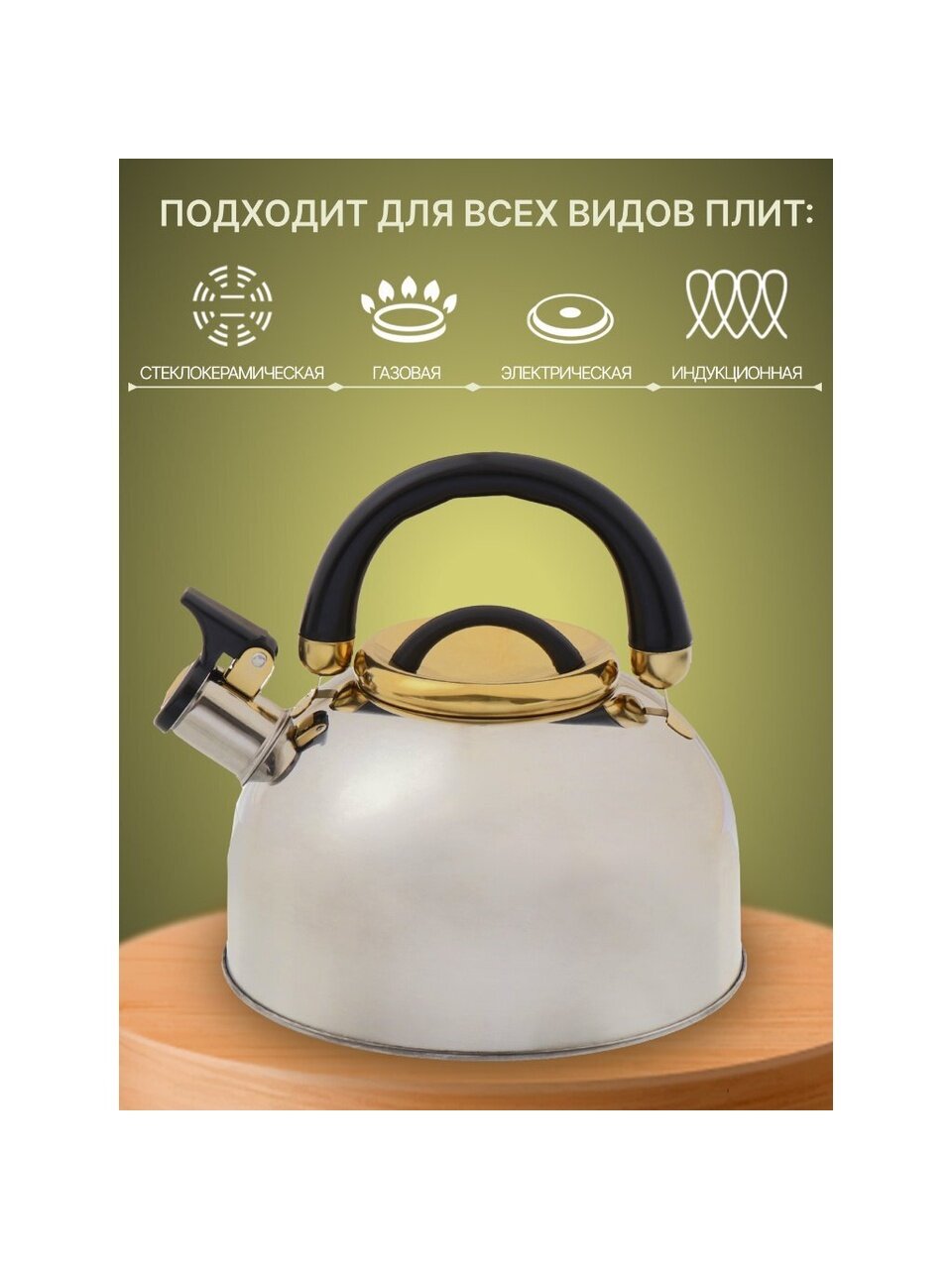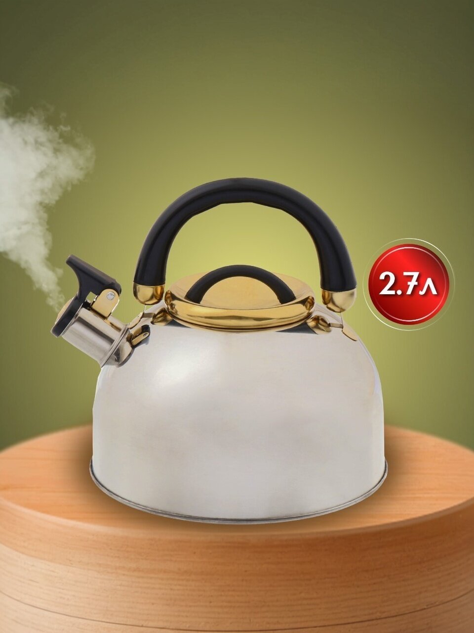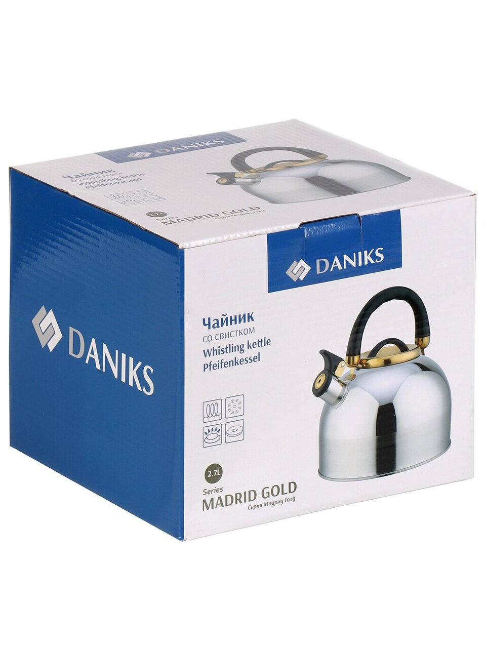 Вы можете приобрести «Чайник нержавеющая сталь, 2.7 л, со свистком, зеркальный, ручка бакелитовая, с силиконовым покрытием, Daniks, Мадрид Голд, индукция, M-001PM» и другие товары в нашем интернет-магазине в Курске по низким ценам и с бесплатным самовывозом.