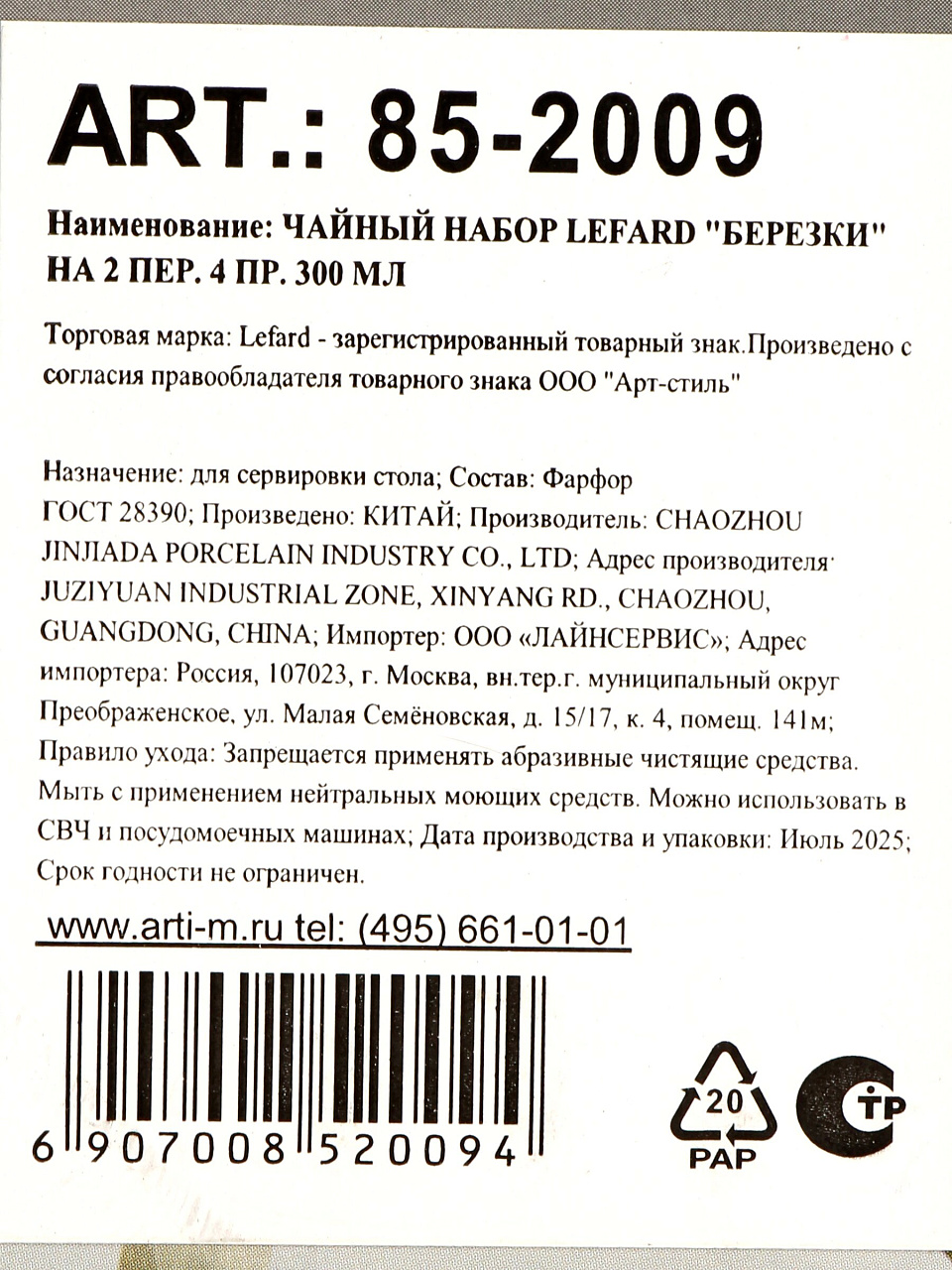 Подарочный чайный набор из фарфора Lefard "Березки" на 2 персоны — элегантное решение для уютных чаепитий и стильных подарков. 4 предмета, 300 мл, золотая кайма.