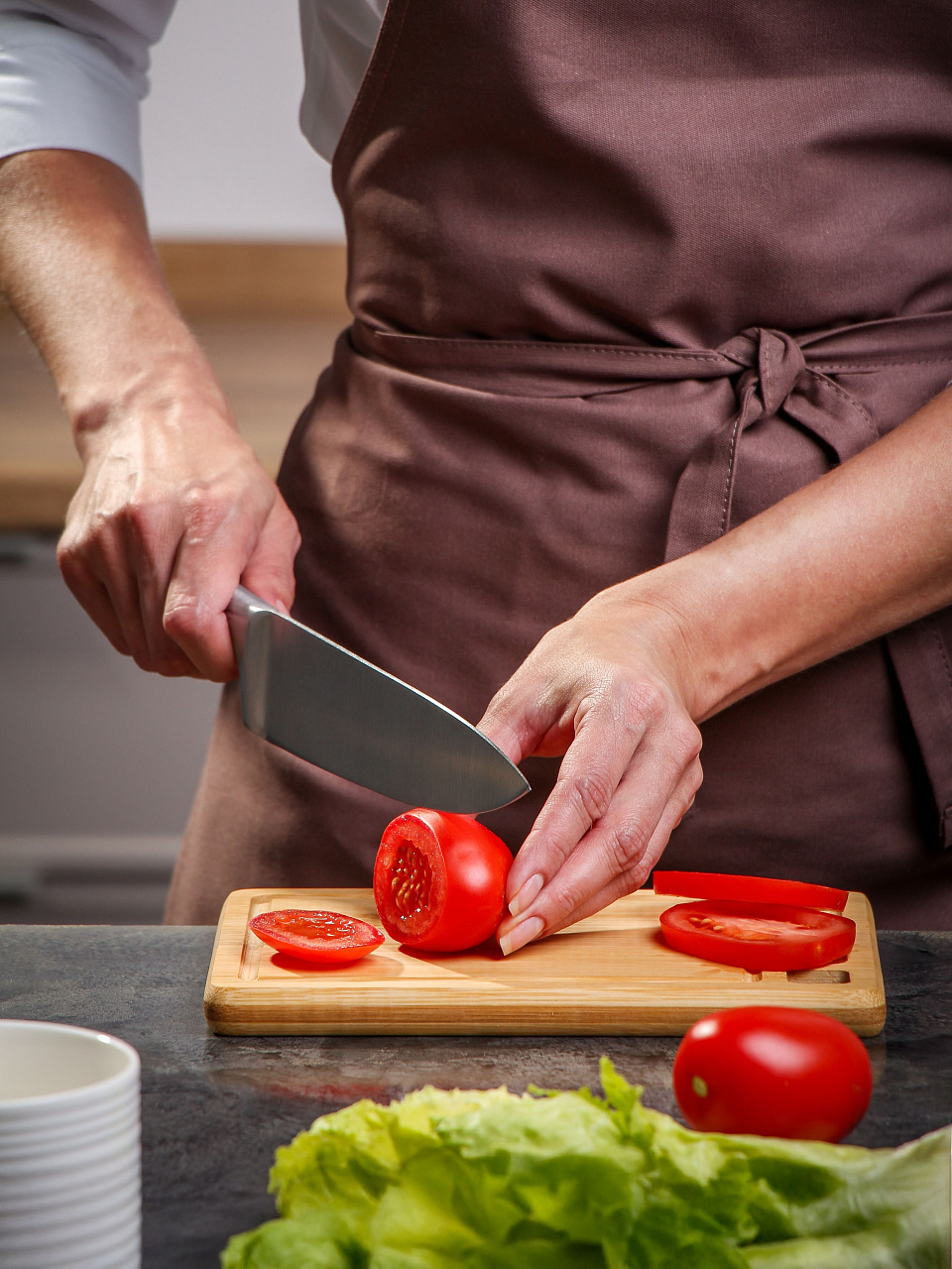 Разделочная доска из бамбука легкая и ее удобно держать в руке во время использования, устойчива к повреждениям, не деформируется при эксплуатации.