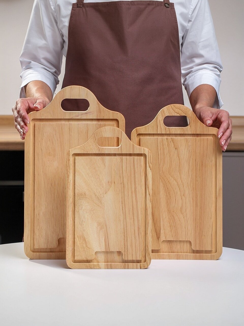 Изготовленные из высококачественного бамбука, эти доски обеспечивают прочность и долговечность, что делает их идеальным выбором для ежедневного использования. Благодаря своей экологичности и натуральной текстуре, бамбук не только устойчив к влаге и деформации, но и придает кухонному пространству особую эстетику.