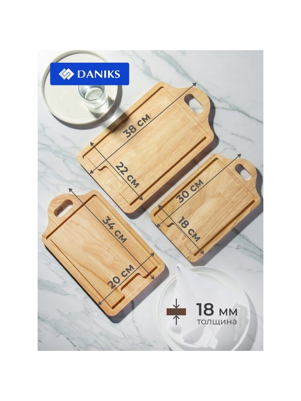 - разнообразие размеров: 38х22х1.8, 34х20х1.8, 30х18х1.8см для различных задач на кухне;