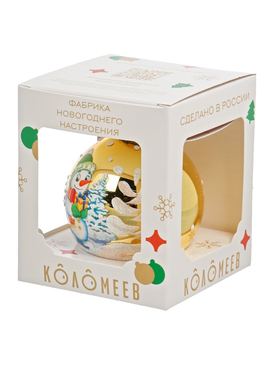 Елочный шар "Снеговик с подарком", диаметр 8 см, изготовлен из стекла с блестящим покрытием и украшен ручной росписью. Такой новогодний шар часто ищут по запросам «какой елочный шар выбрать для подарка», «что лучше для украшения елки». Он отличается от пластиковых аналогов экологичностью, изысканным внешним видом и долговечностью при аккуратном использовании. Благодаря среднему размеру и универсальному золотому цвету, шар гармонично впишется в любой интерьер и станет центральным элементом новогоднего убранства.