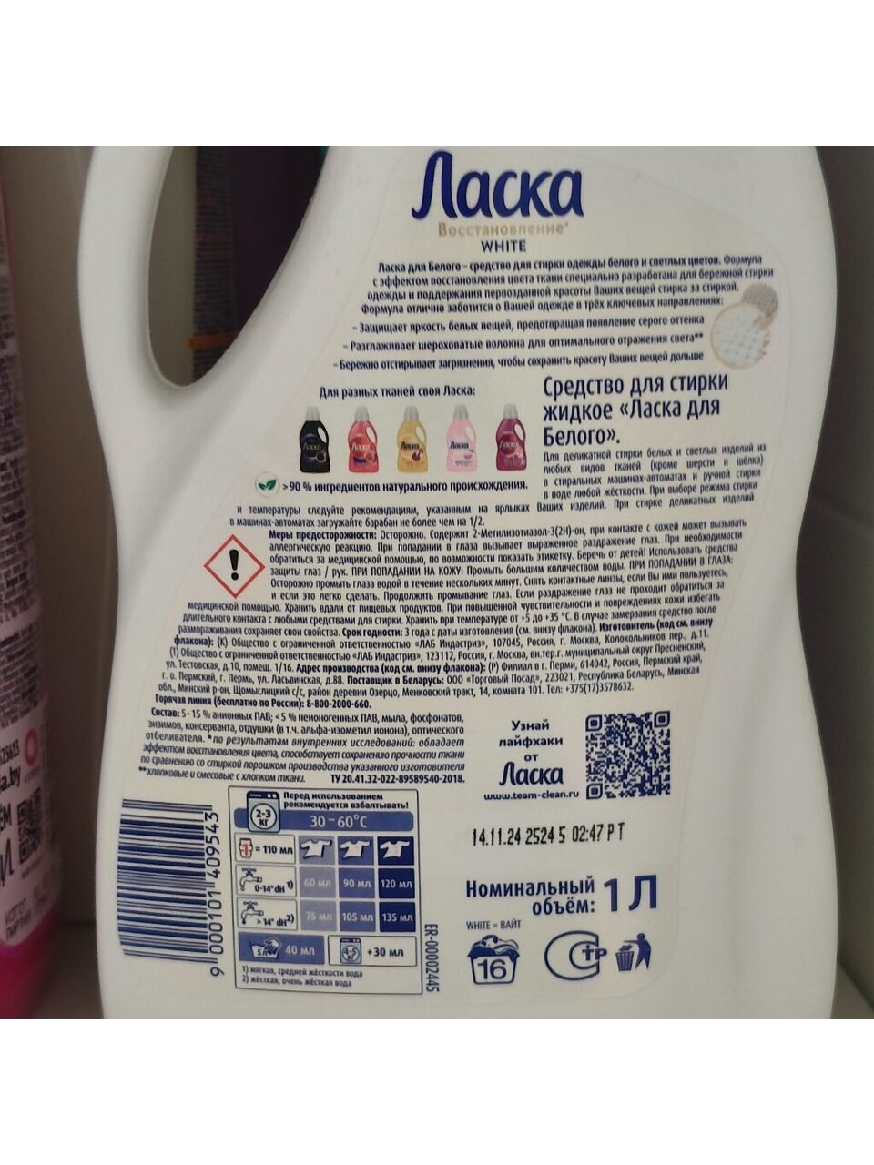 Жидкий порошок Ласка Восстановление для белого эффективно и бережно отстирывает загрязнения на одежде и белье. Формула содержит специальный оптический отбеливатель, благодаря чему средство Ласка восстанавливает и сохраняет белизну вещей, предотвращая появление серого оттенка. Активные компоненты способствуют уменьшению количества катышков на ткани и сохраняют прочность волокон ткани. В результате регулярного использования средства для стирки Ласка поверхность ткани становится более гладкой.