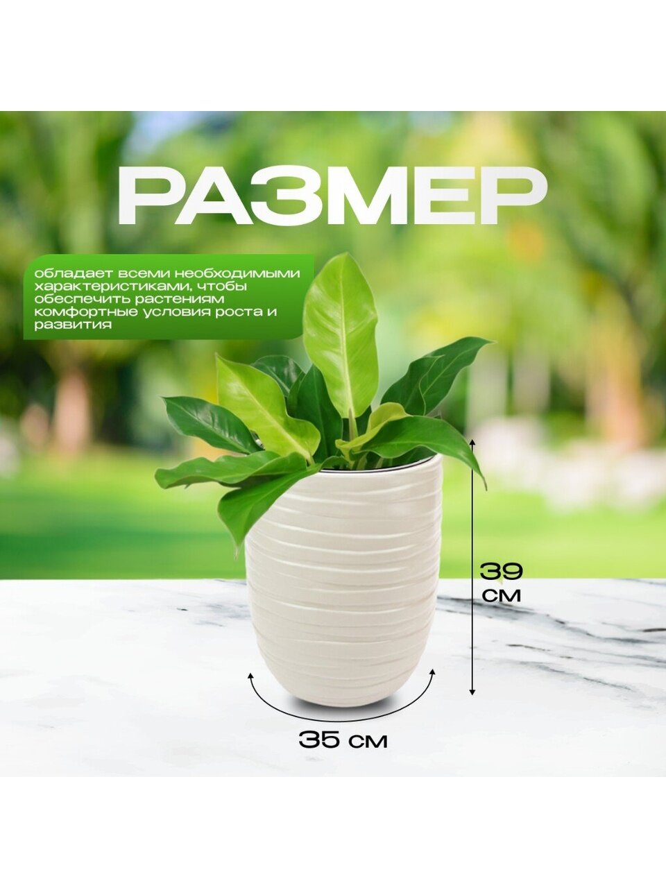 - Кашпо из прочного пластика не боится прямых солнечных лучей и перепадов температур;