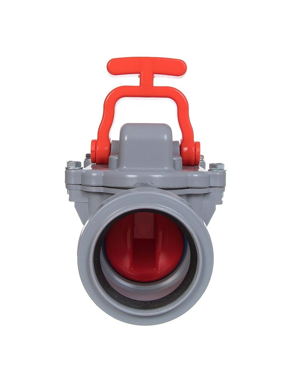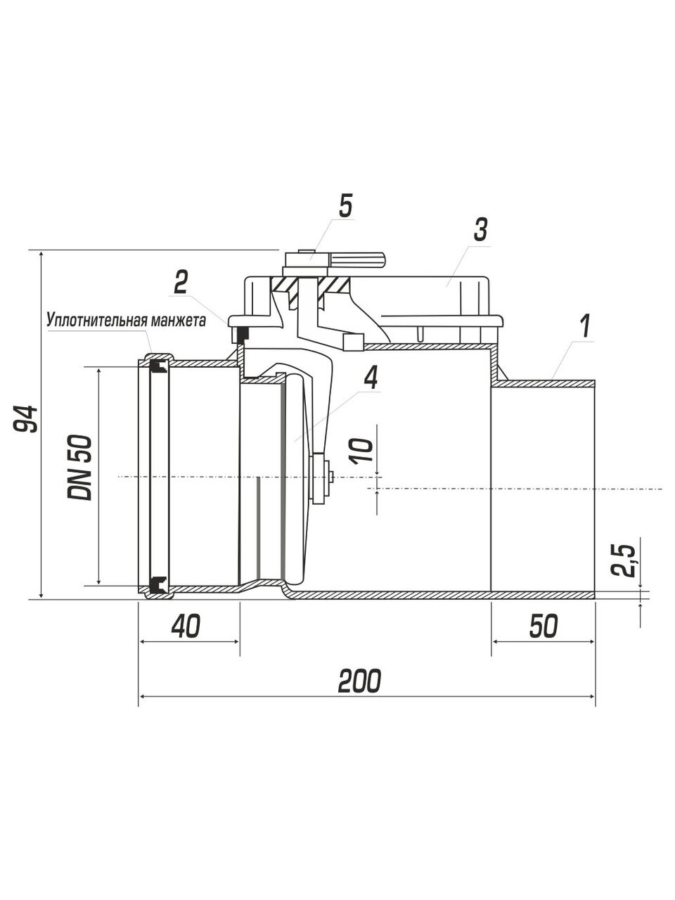 Клапан обратный канализационный с запирающей заслонкой из профилированной нержавеющей стали с язычковым уплотнением, с ревизионной крышкой и присоединительными выходами под раструбные трубы ПП, ПВХ, с возможностью фиксации заслонки в закрытом состоянии при помощи ручного фиксатора с предохранителем от самопроизвольного закрытия.