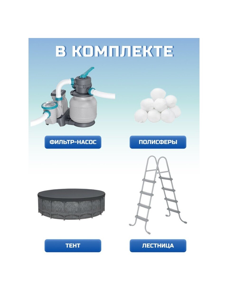 Фильтрующие шарики полисферы, входящие в комплект, представляют собой легкую, моющуюся и многоразовую замену традиционного песка, необходимого для работы фильтрующего насоса. Это значительно упрощает обслуживание бассейна и делает его использование более комфортным. Производительность фильтр-насоса составляет 8327 литров, что обеспечивает чистоту и прозрачность воды.