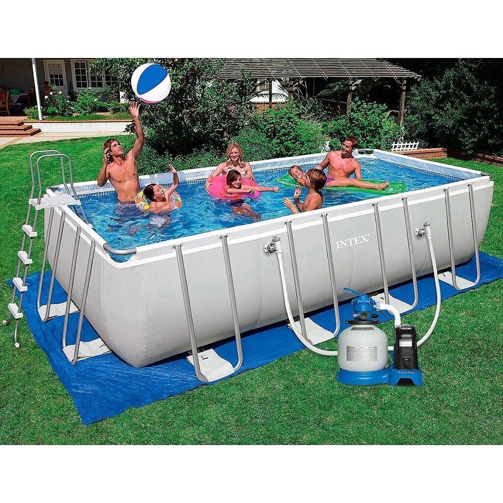 Сборный бассейн Intex имеет полную комплектацию: поставляется с фильтр-насосом, лестницей, тентом и подстилкой.