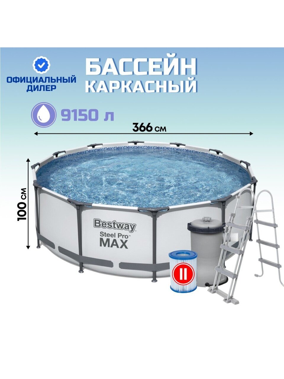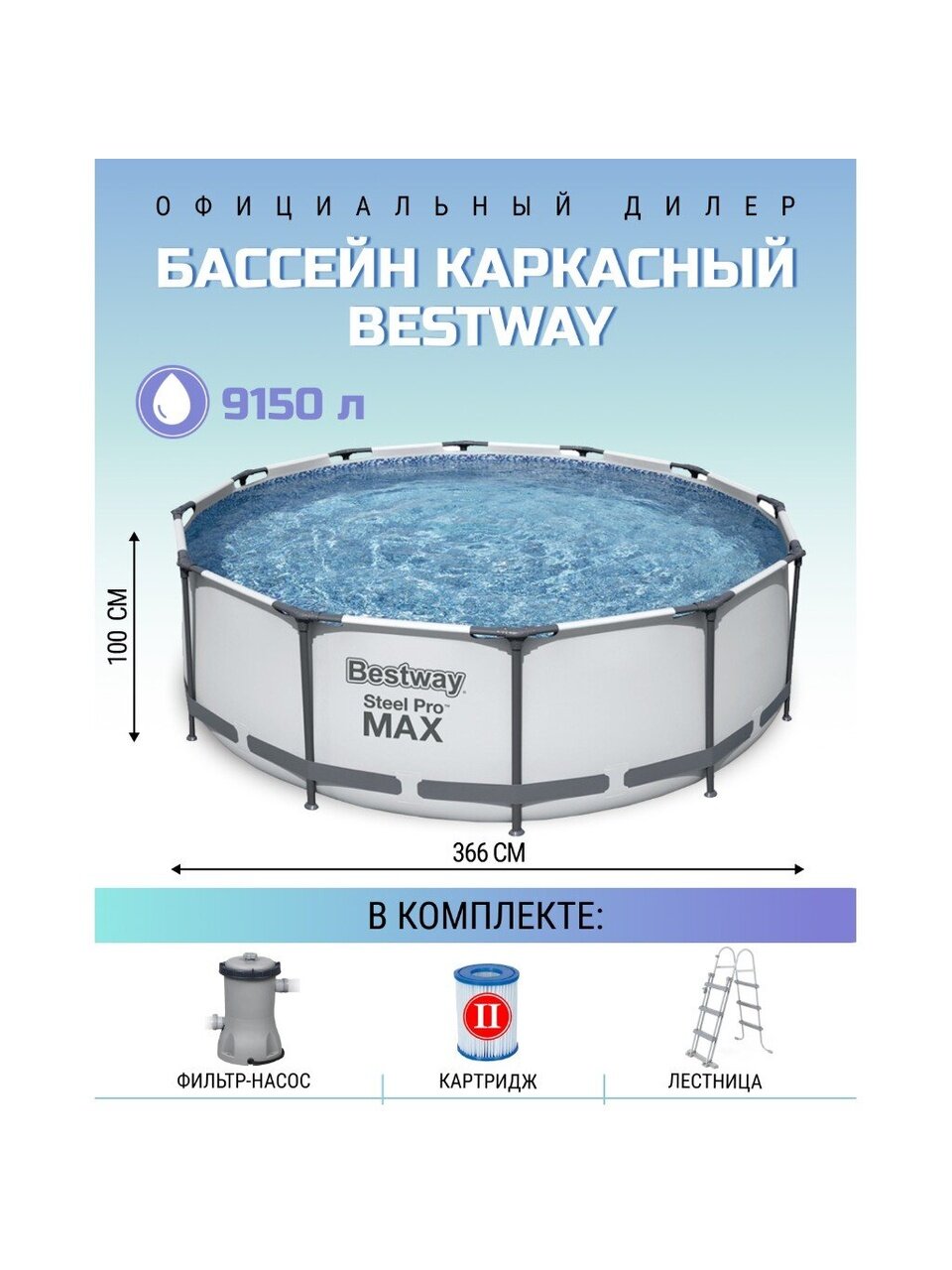 Вы можете приобрести «Бассейн каркасный Bestway, 366х100 см, Steel Pro Max, 56418BW, фильтр-насос, лестница, 9150 л, картридж» и другие товары в нашем интернет-магазине в Ставрополе по низким ценам и с бесплатным самовывозом.