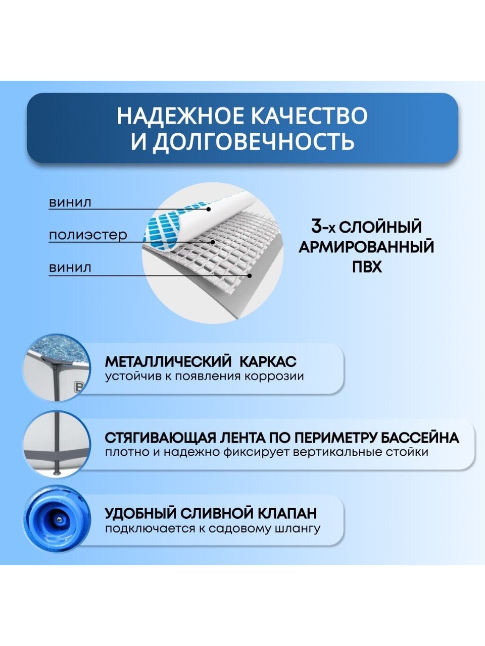 - прочность и надежность благодаря стальному каркасу и трехслойному ПВХ