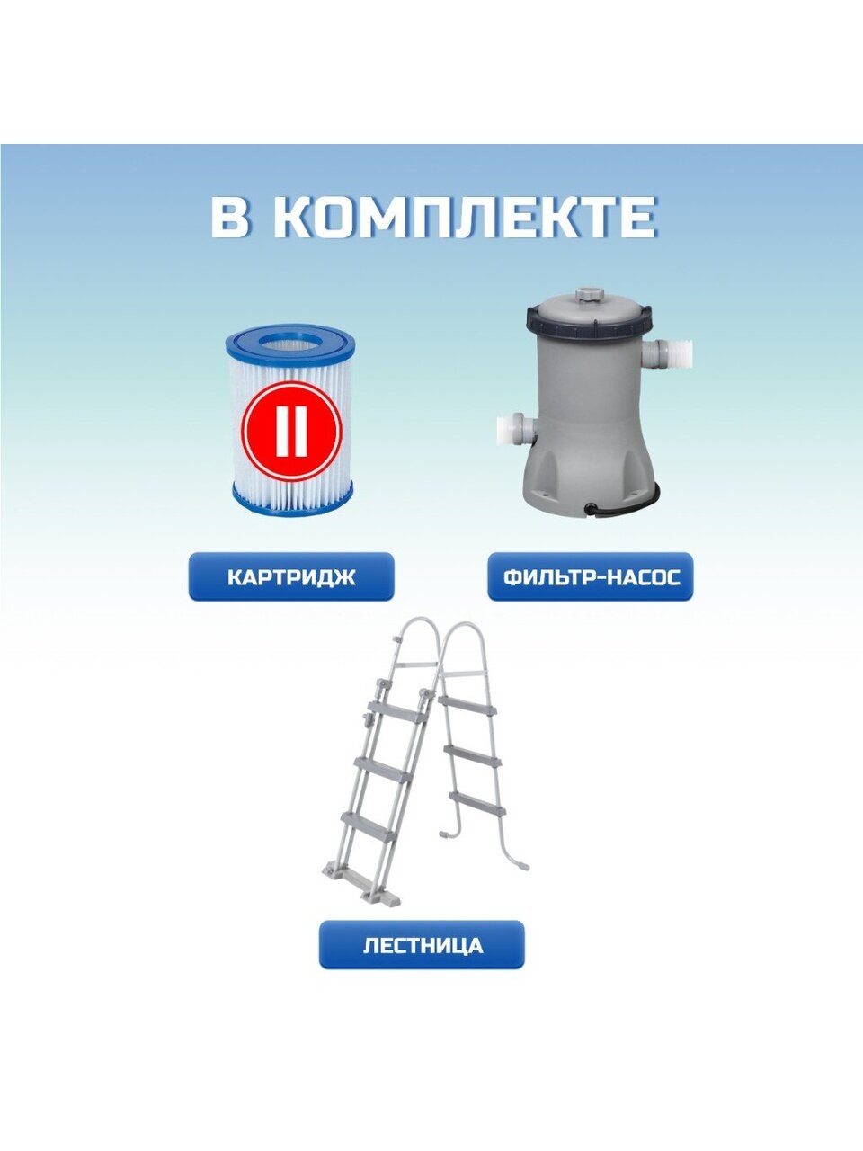 Бассейн каркасный Bestway Steel Pro Max 56418BW оснащен фильтр-насосом с производительностью 2006 л/ч и мощностью 40 Вт, который поддерживает чистоту воды и позволяет вам наслаждаться кристально чистым купанием. Картриджный фильтр типа II обеспечивает эффективную фильтрацию, а лестница, выдерживающая до 150 кг, обеспечивает удобный доступ в бассейн. Внутренняя поверхность бассейна имеет расцветку под мозаику, что придает ему стильный и современный вид.