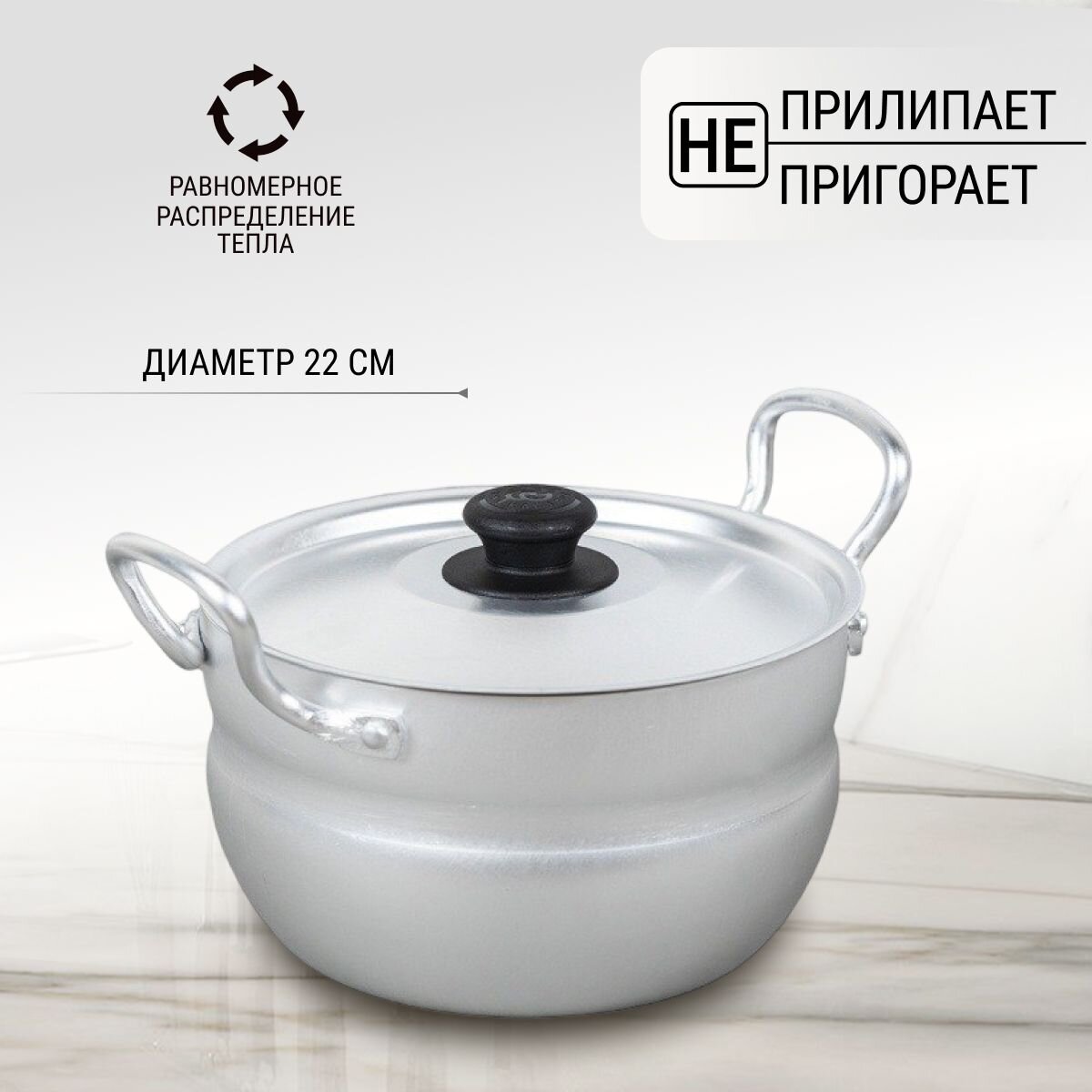 - Безопасный алюминий: прочный корпус и крышка, диаметр 22 см, толщина дна 1.5 мм, срок службы — до 2 лет по гарантии.
