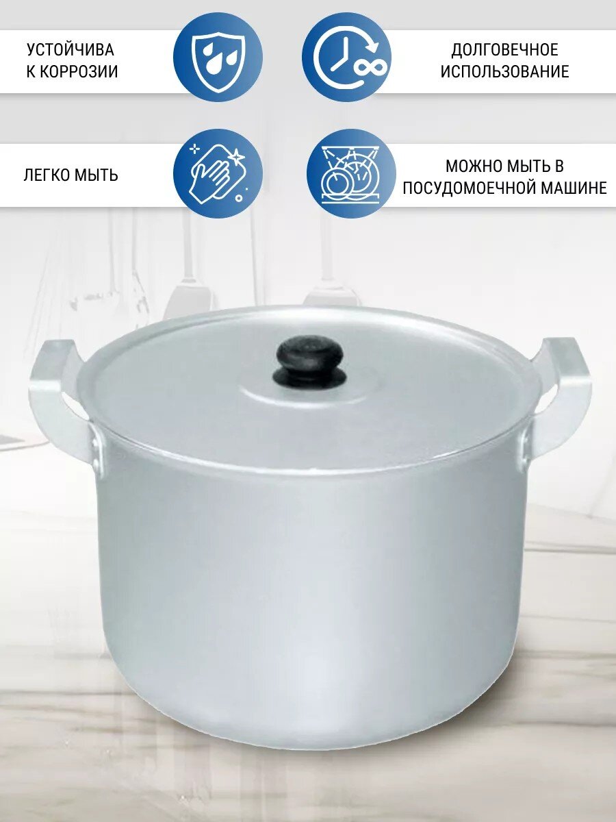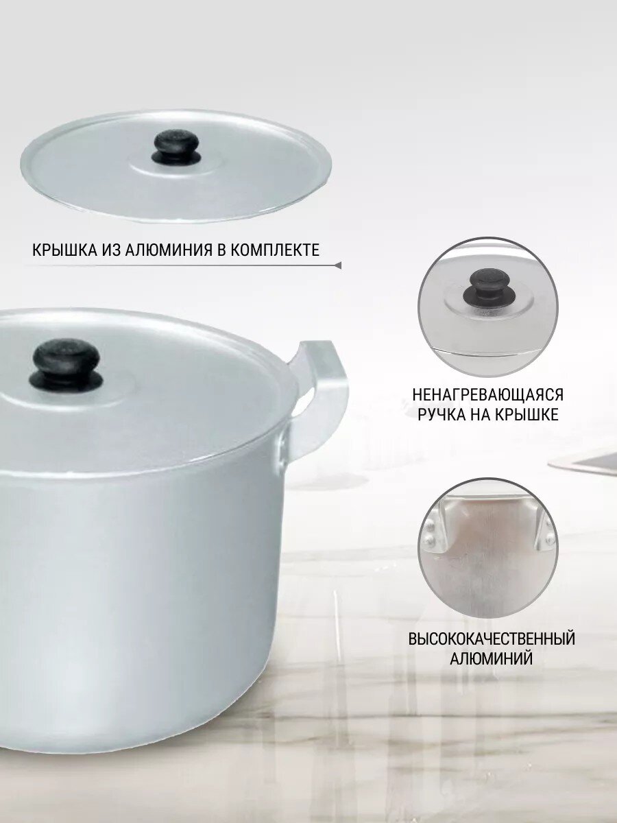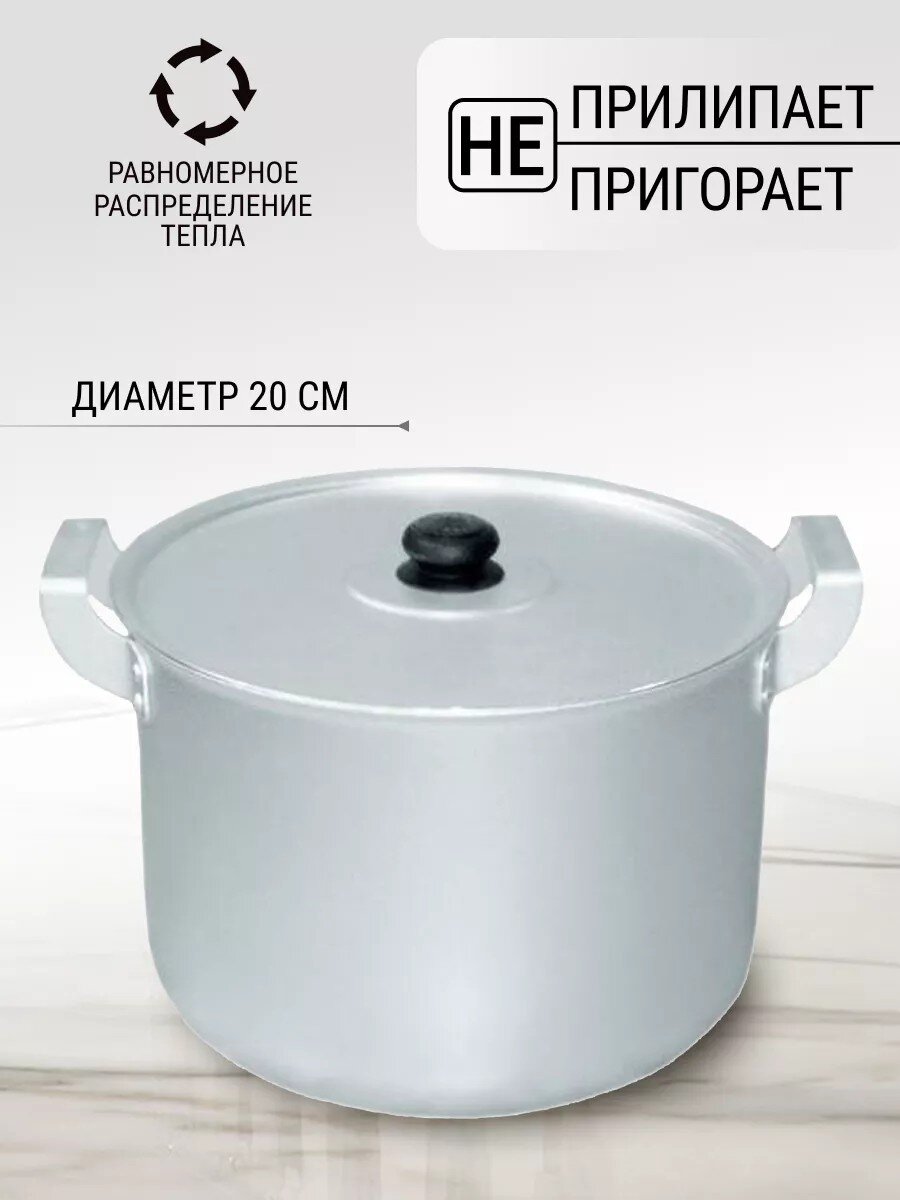 В сравнении с эмалированными или стальными аналогами, алюминий значительно легче, быстрее нагревается и проще в уходе. Если важно купить недорого кастрюлю для дачи или для семьи, этот вариант — оптимальное сочетание цены и надёжности. Кастрюля не имеет выпускного клапана и мерной шкалы, что делает её максимально простой в обслуживании и долговечной при правильном использовании.