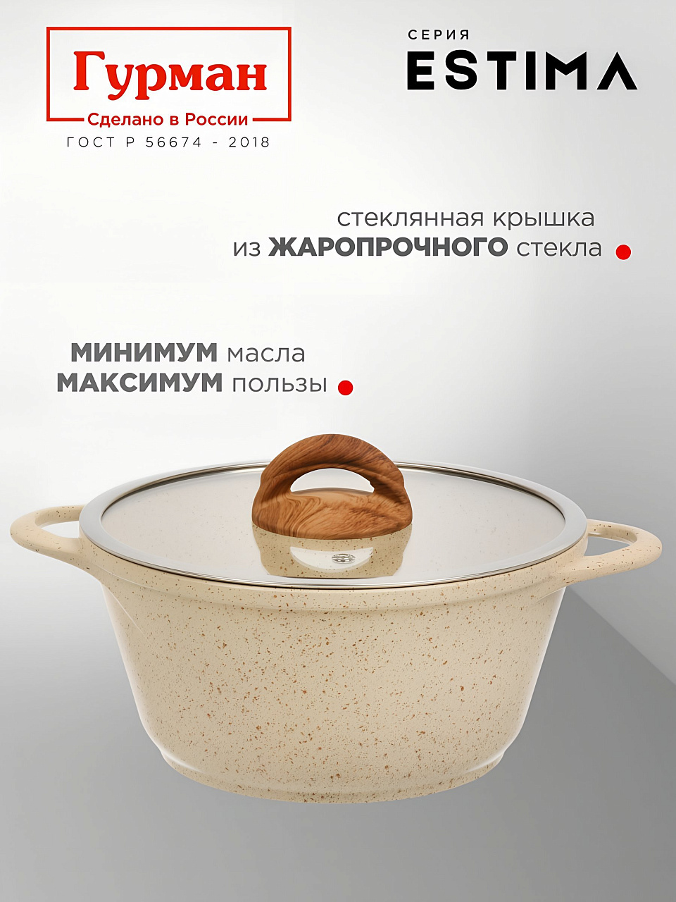 Кастрюля 2 л Гурман Estima: антипригарное покрытие, подходит для индукции, стеклянная крышка, гарантия 36 мес. — идеальный выбор для кухни и дачи