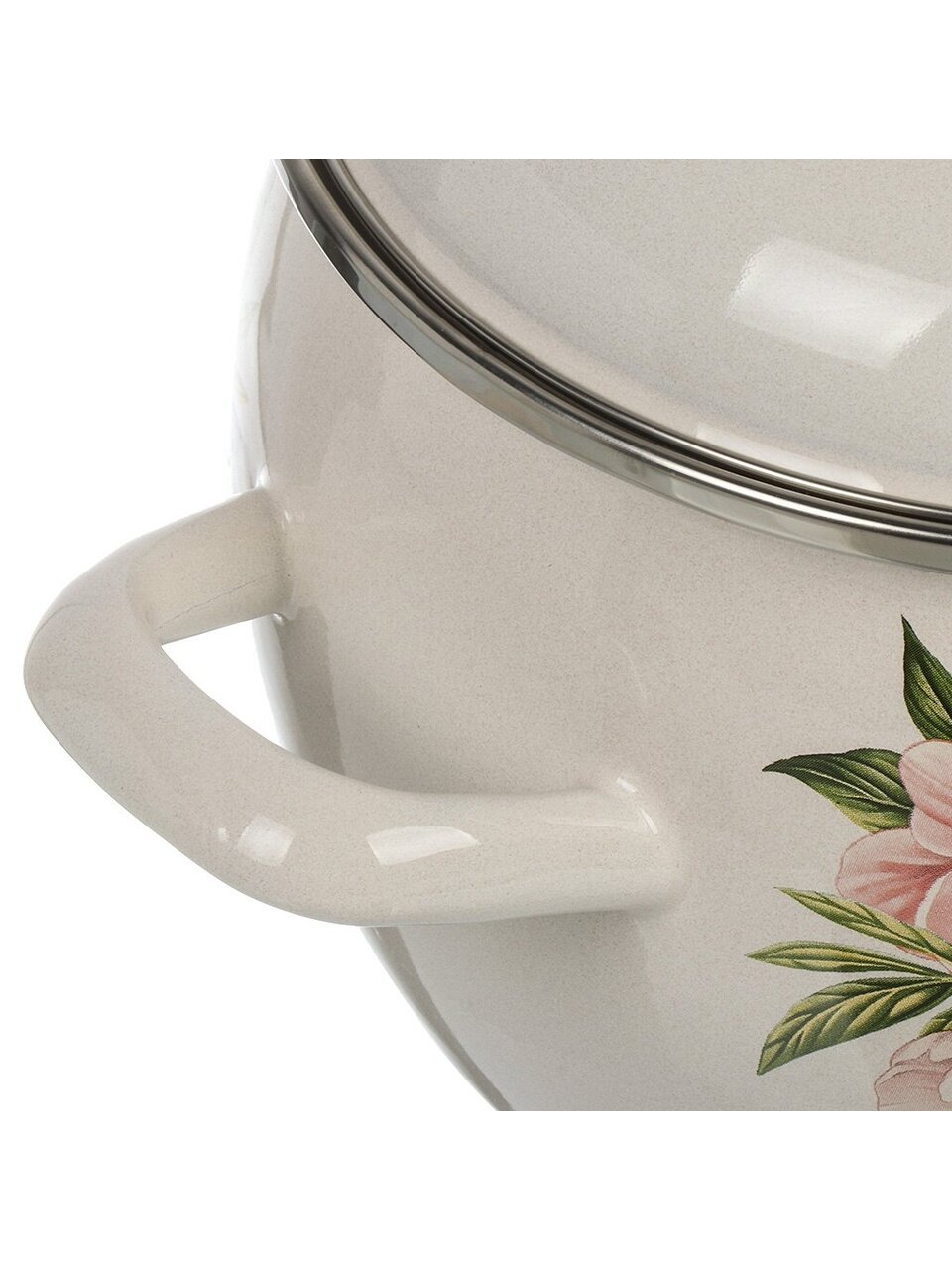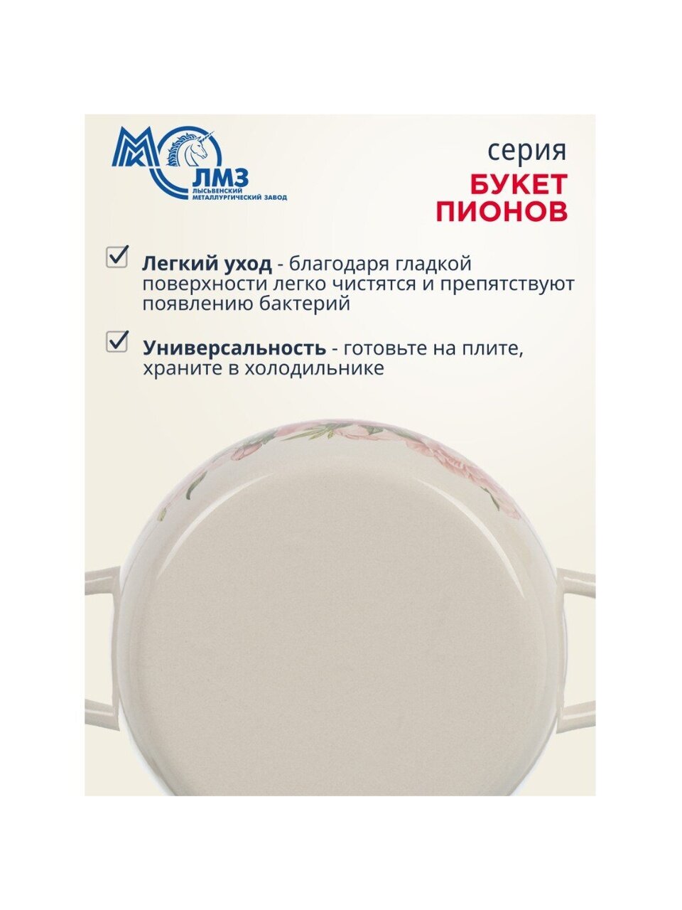 Кастрюля из коллекции "Букет пионов" от бренда ЛЗЭП сочетает в себе элегантность и функциональность. Ее молочный цвет и изысканный рисунок создадут атмосферу уюта и тепла на кухне, а полусферическая форма крышки добавит утонченности. Эмалированная сталь, из которой изготовлено изделие, обеспечивает долговечность и надежность, а также легкость в уходе.
