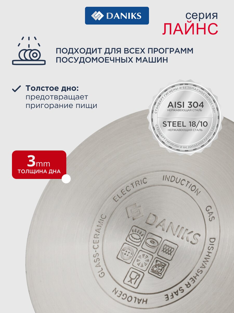 Кастрюля Daniks Лайнс 2.9 л — универсальное решение из нержавеющей стали для индукции и любых плит: готовьте супы, каши, пельмени легко и безопасно.