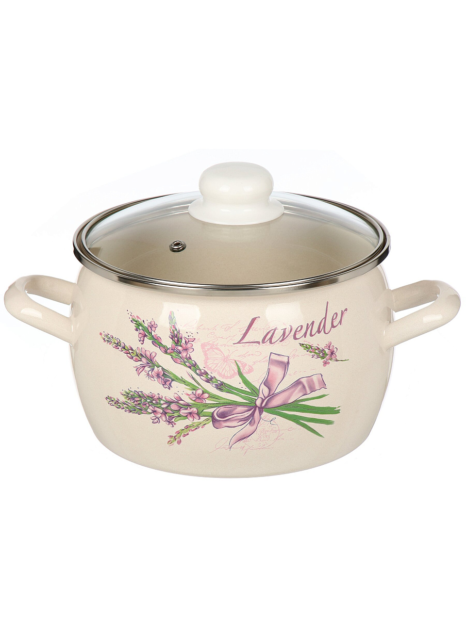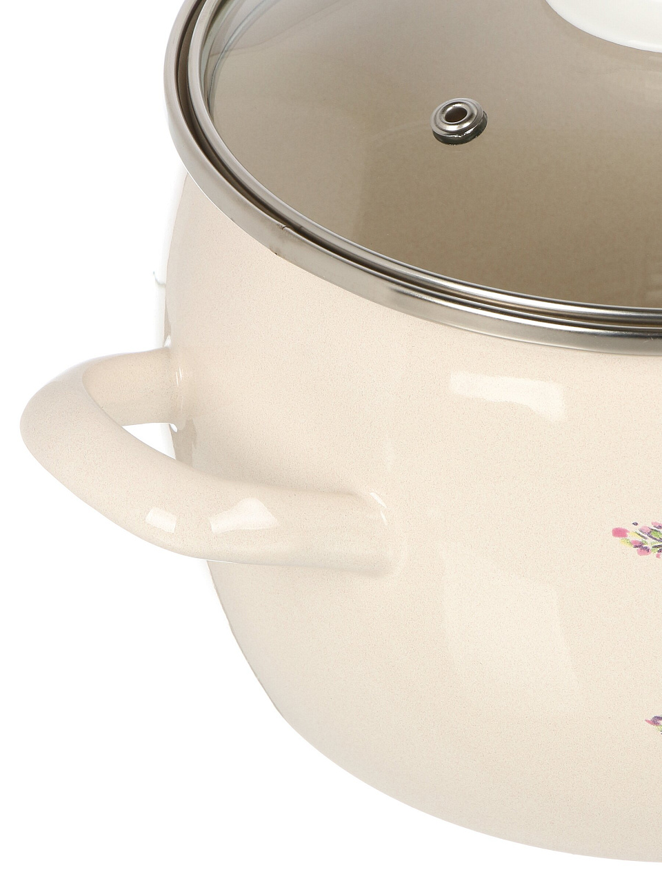 Кастрюля эмалированная ЛЗЭП Лаванда 3,5 л: универсальное решение для индукции и газовых плит, стеклянная крышка, стильный бежевый дизайн.