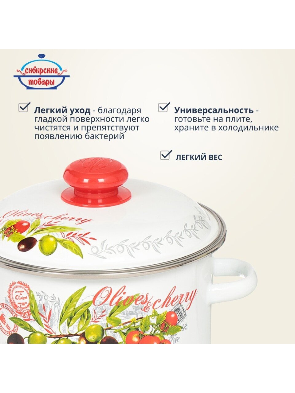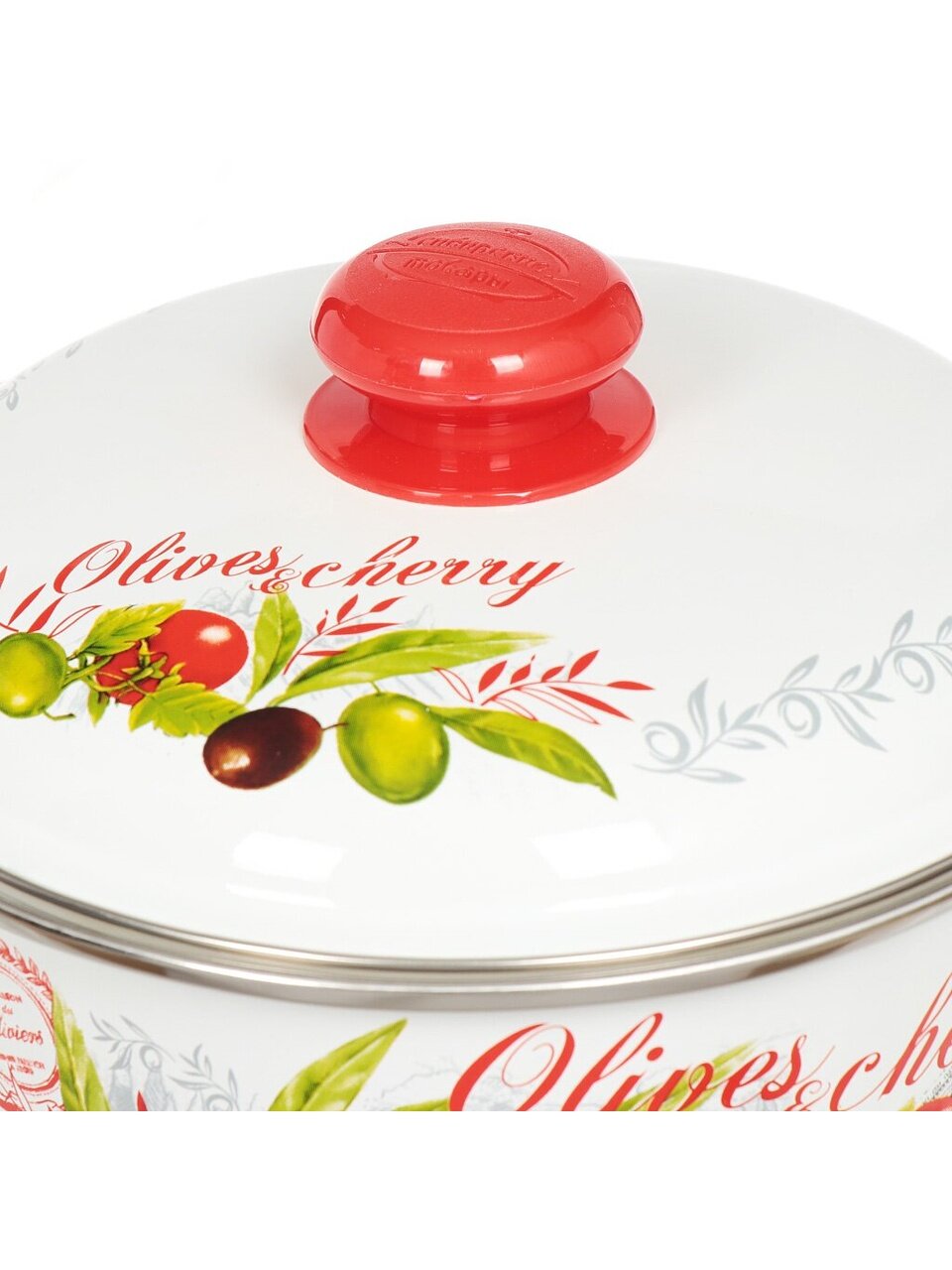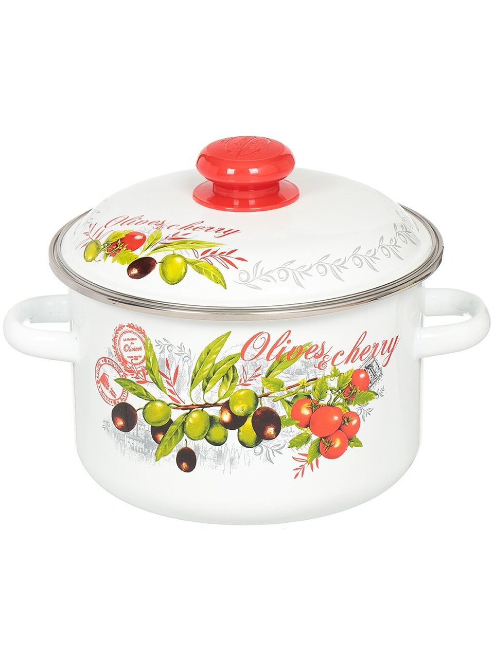 Кастрюля эмалированная 3 л «Оливки и черри» — универсальное решение для кухни и дачи: долговечная сталь, подходит для индукции, легко мыть, яркий дизайн.