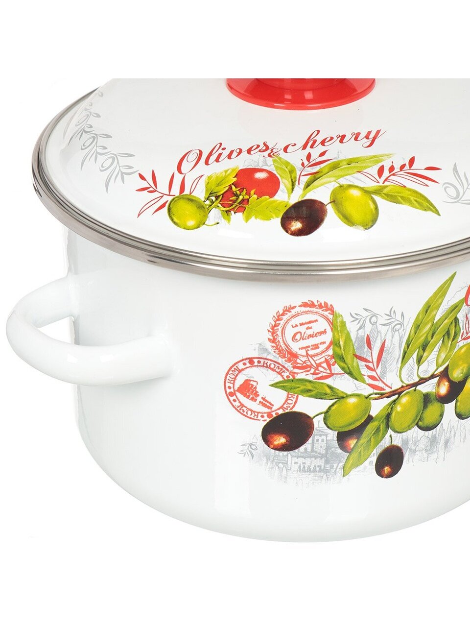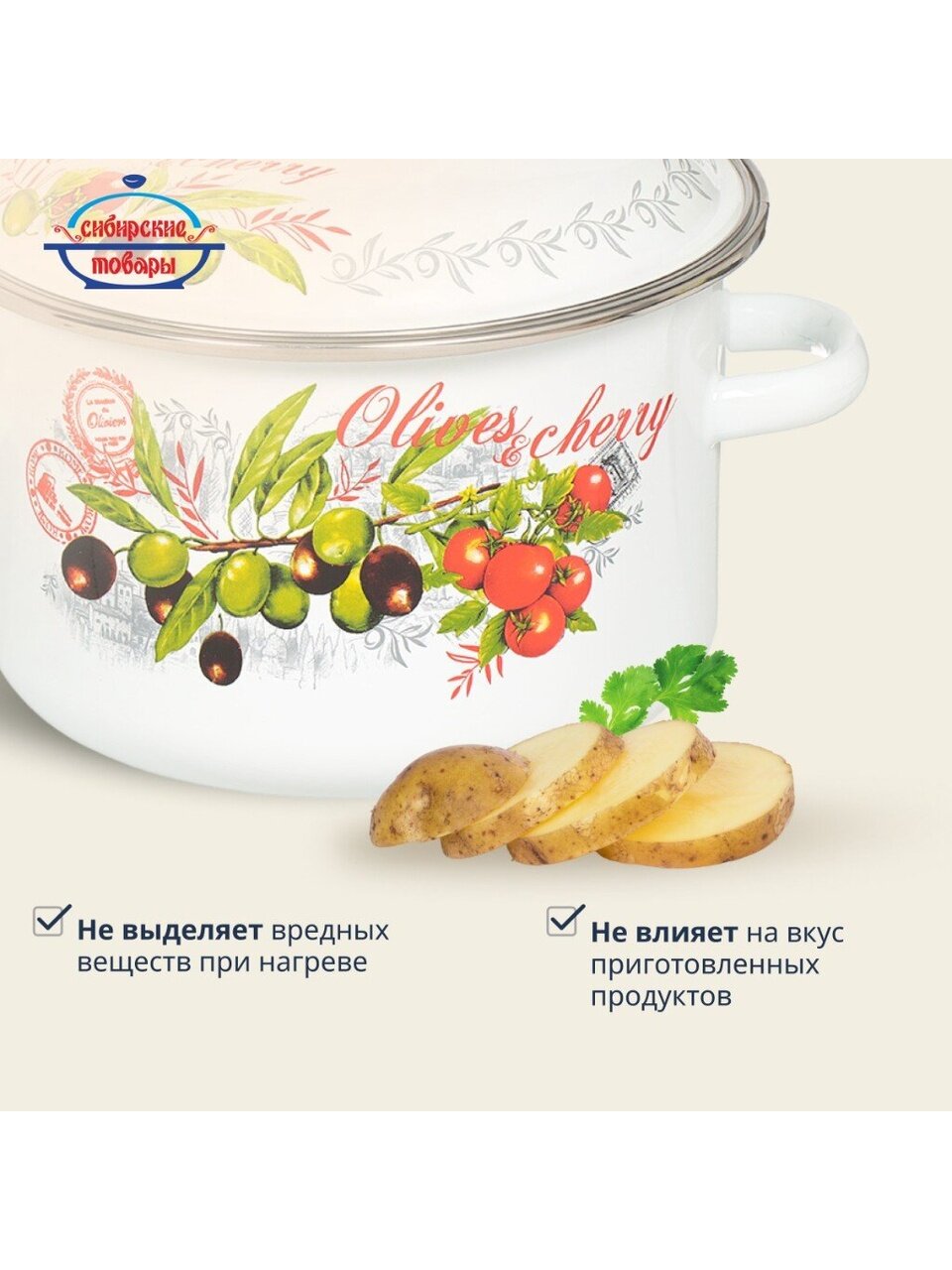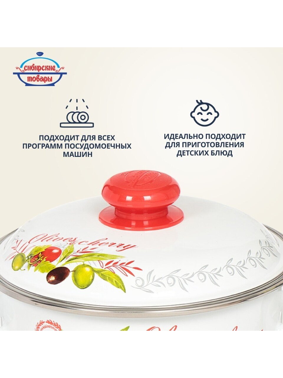 Кастрюля эмалированная 3 л «Оливки и черри» — универсальное решение для кухни и дачи: долговечная сталь, подходит для индукции, легко мыть, яркий дизайн.