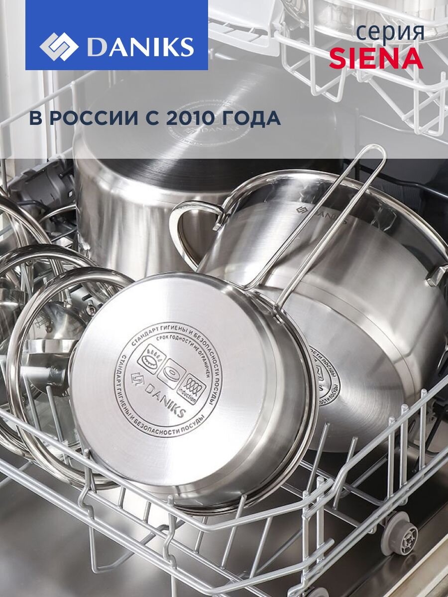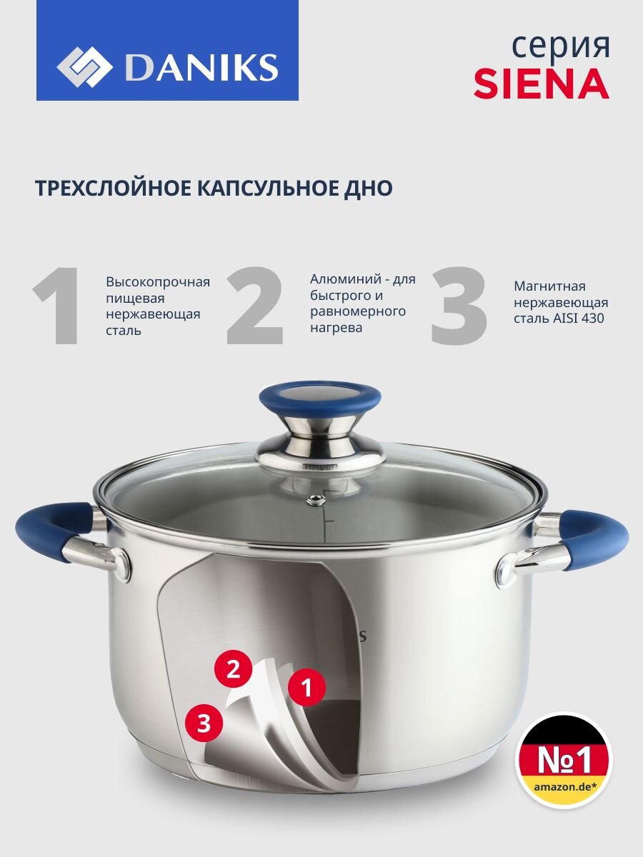 Кастрюля из нержавеющей стали Daniks Siena 4,75 л с капсульным дном и стеклянной крышкой — оптимальный выбор для индукционных и любых других плит. Готовьте дома, на даче или в подарок с выгодой!
