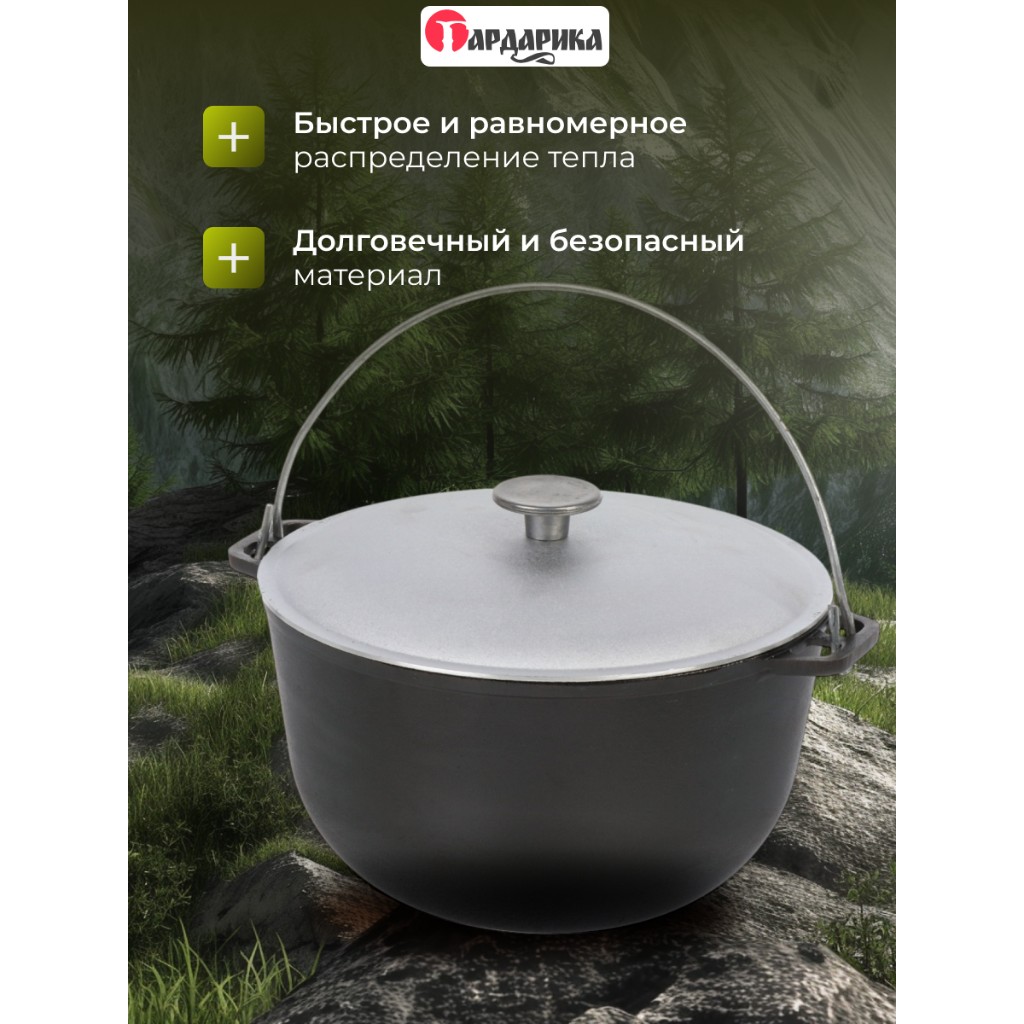 - В походном чугунном казане можно приготовить различные блюда, что делает его незаменимым помощником для туристов, рыбаков и охотников.