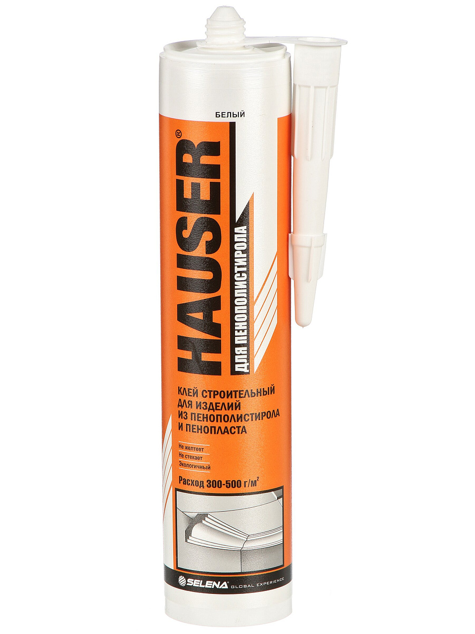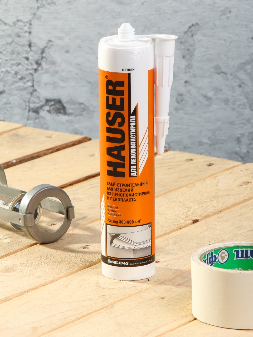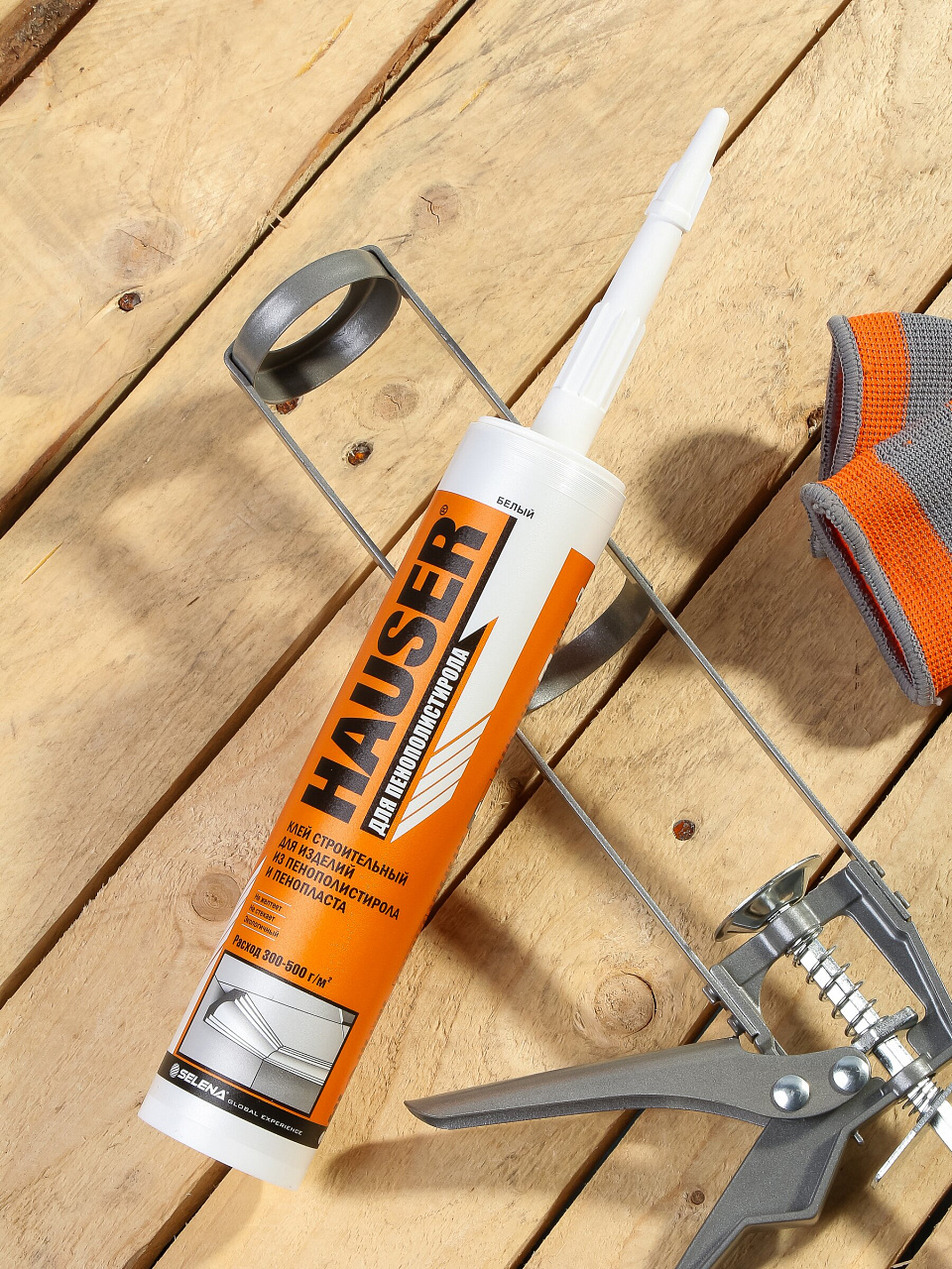 Для внутренних работ оптимален акриловый клей Hauser: он не выделяет запаха, быстро схватывается, подходит для монтажа пенополистирола, легко наносится картриджем.