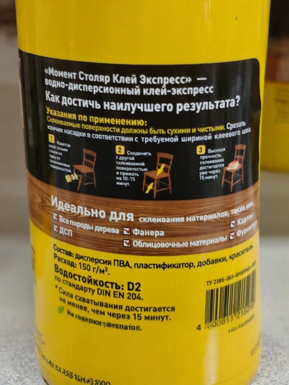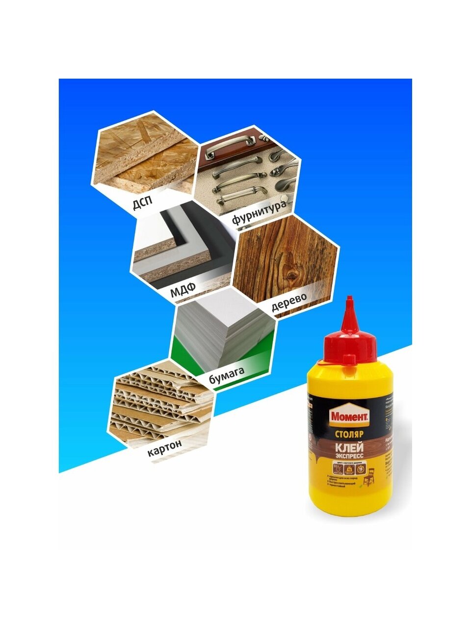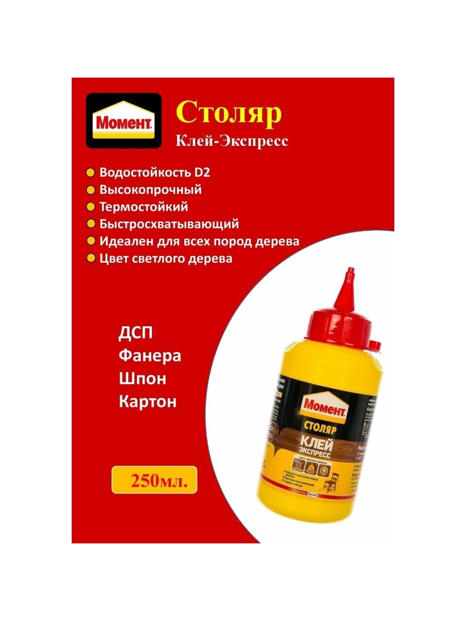 Момент Столяр рекомендуется применять при сборке и ремонте мебели. Продукт представлен в современной пластиковой упаковке, снабженной специальным носиком, облегчающим его хранение и применение. Является термостойким, высокопрочным и быстросхватывающим.