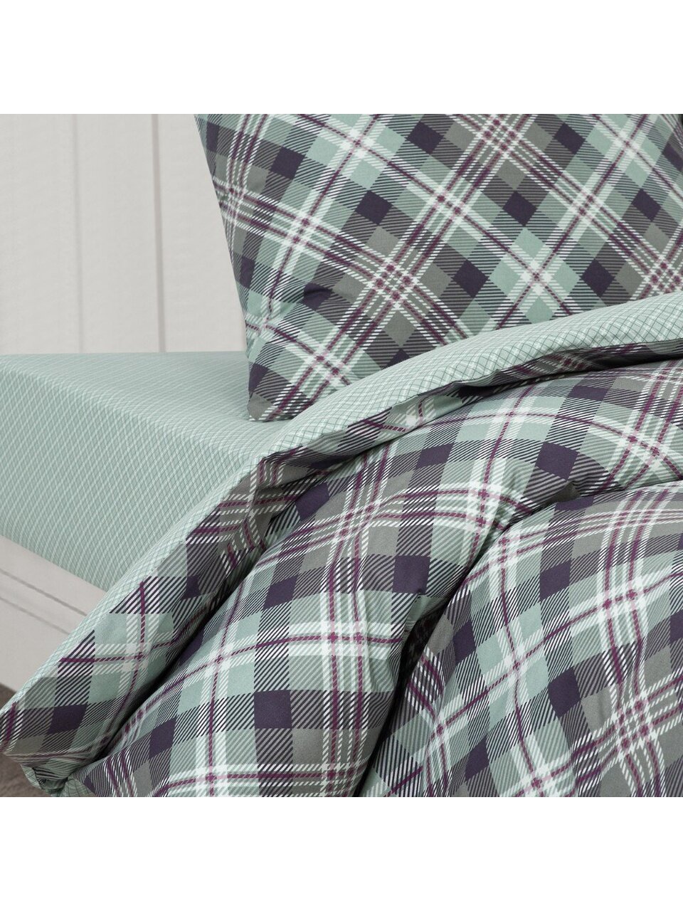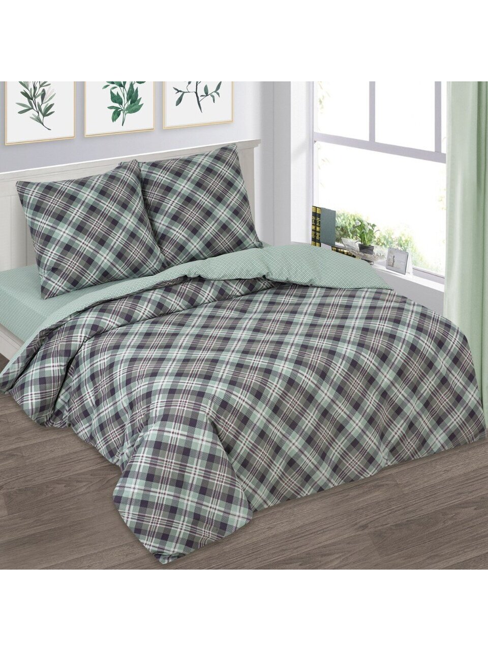 В наборе 5 предметов: простыня на резинке 180х200 см, 2 наволочки 70х70 см, 2 пододеяльника 145х215 см. Материал — 100% хлопковый поплин, плотный и приятный на ощупь.