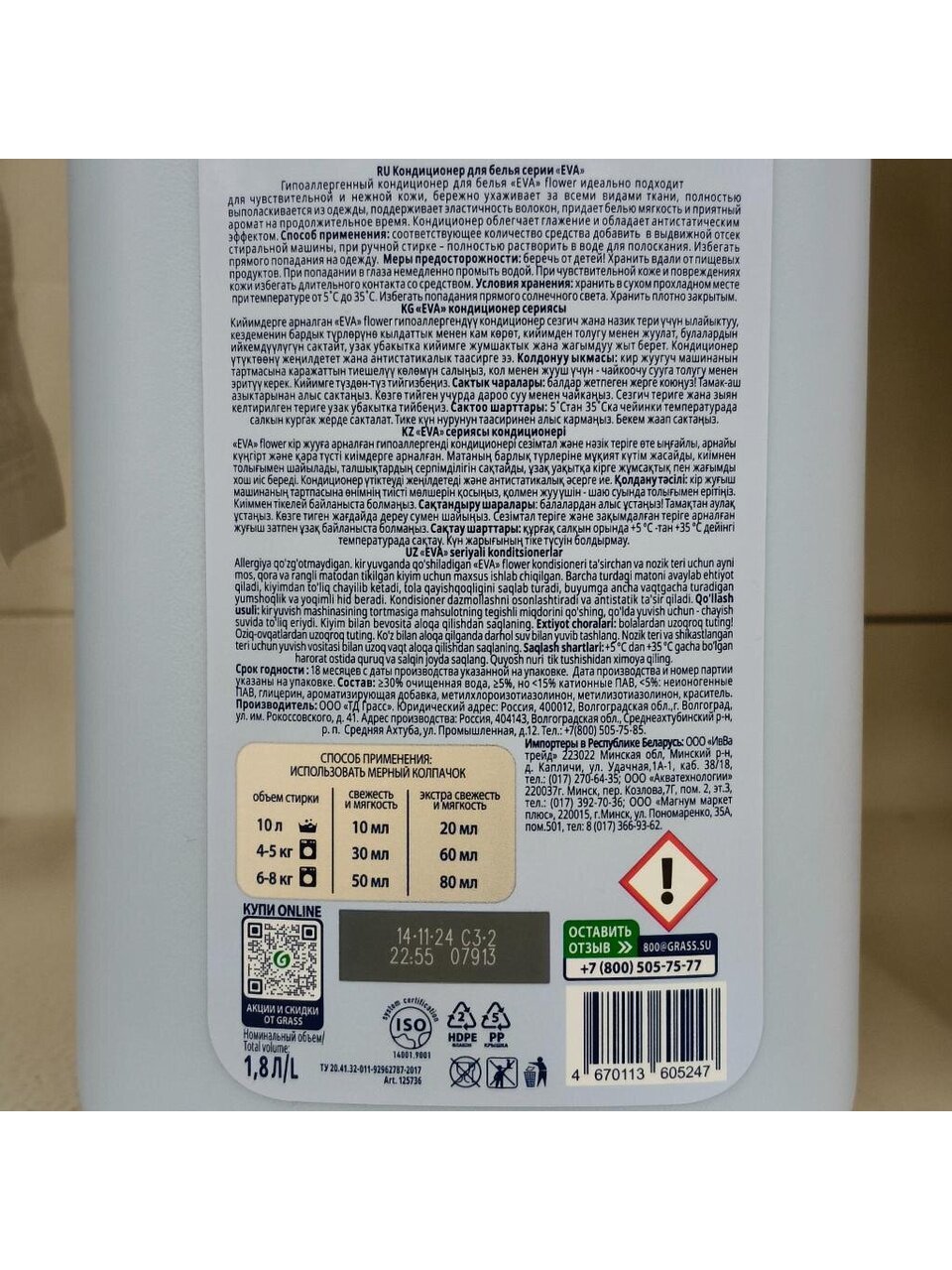 Кондиционер для белья Grass Eva Flower 1.8 л — концентрированная свежесть и мягкость для вашего белья на долгое время, экономия до 60% средств.