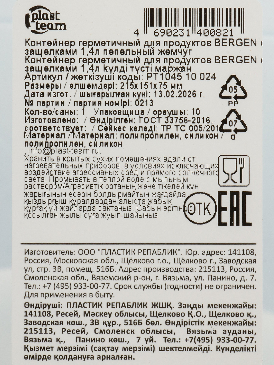 Контейнер пищевой пластик, 1.4 л, 21.5х15.1х7.5 см, пепельный жемчуг, прямоугольный, Plast team, Bergen, PT104510024 - фото 1 от пользователя