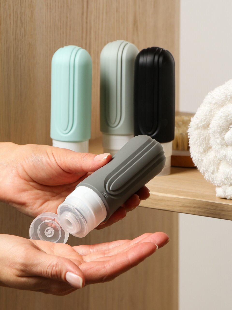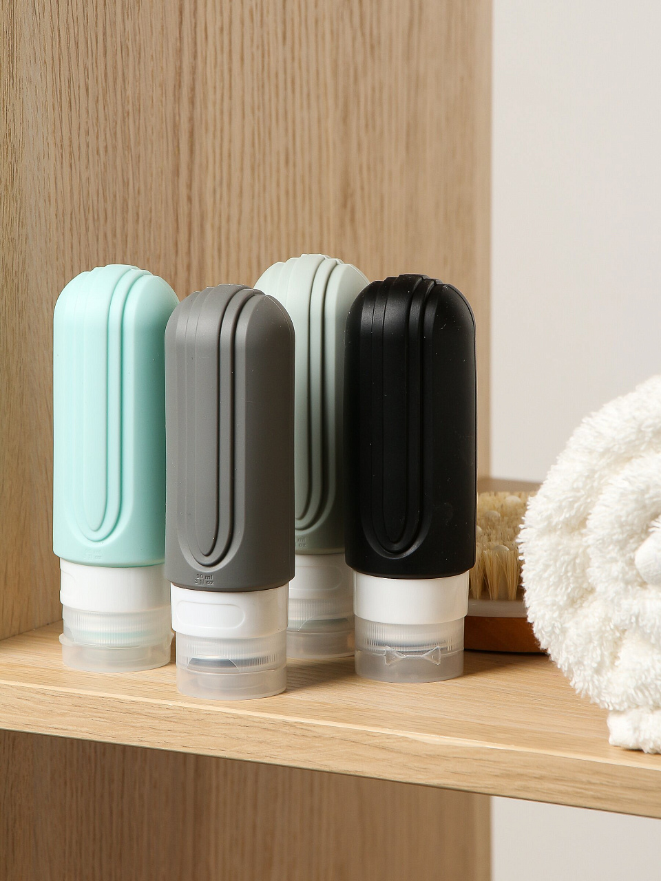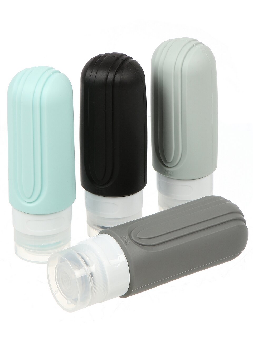 В наборе 4 флакона оптимального объёма (до 100 мл каждый), что полностью соответствует требованиям авиакомпаний для провоза жидкостей в ручной клади. Пластик и силикон безопасны для хранения средств.