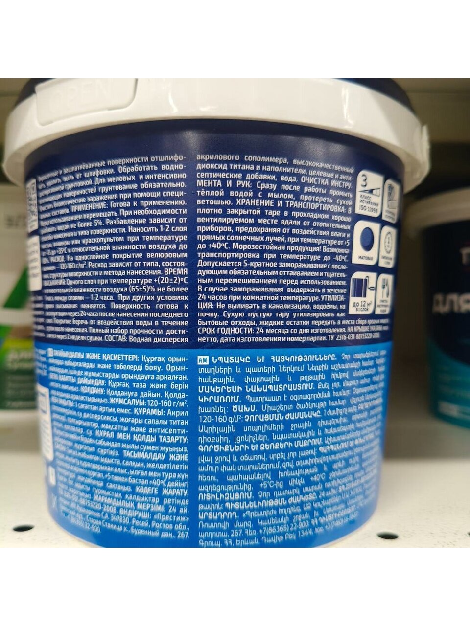 Экологически чистая акриловая краска. Обладает хорошей устойчивостью к истираемости. Данная краска образует ровную матовую поверхность и остается остается белоснежной долгие годы. Является универсальной и обладает хорошими адгезией и укрывистостью. Также краска удобна: в работе не стекает и не разбрызгивается.