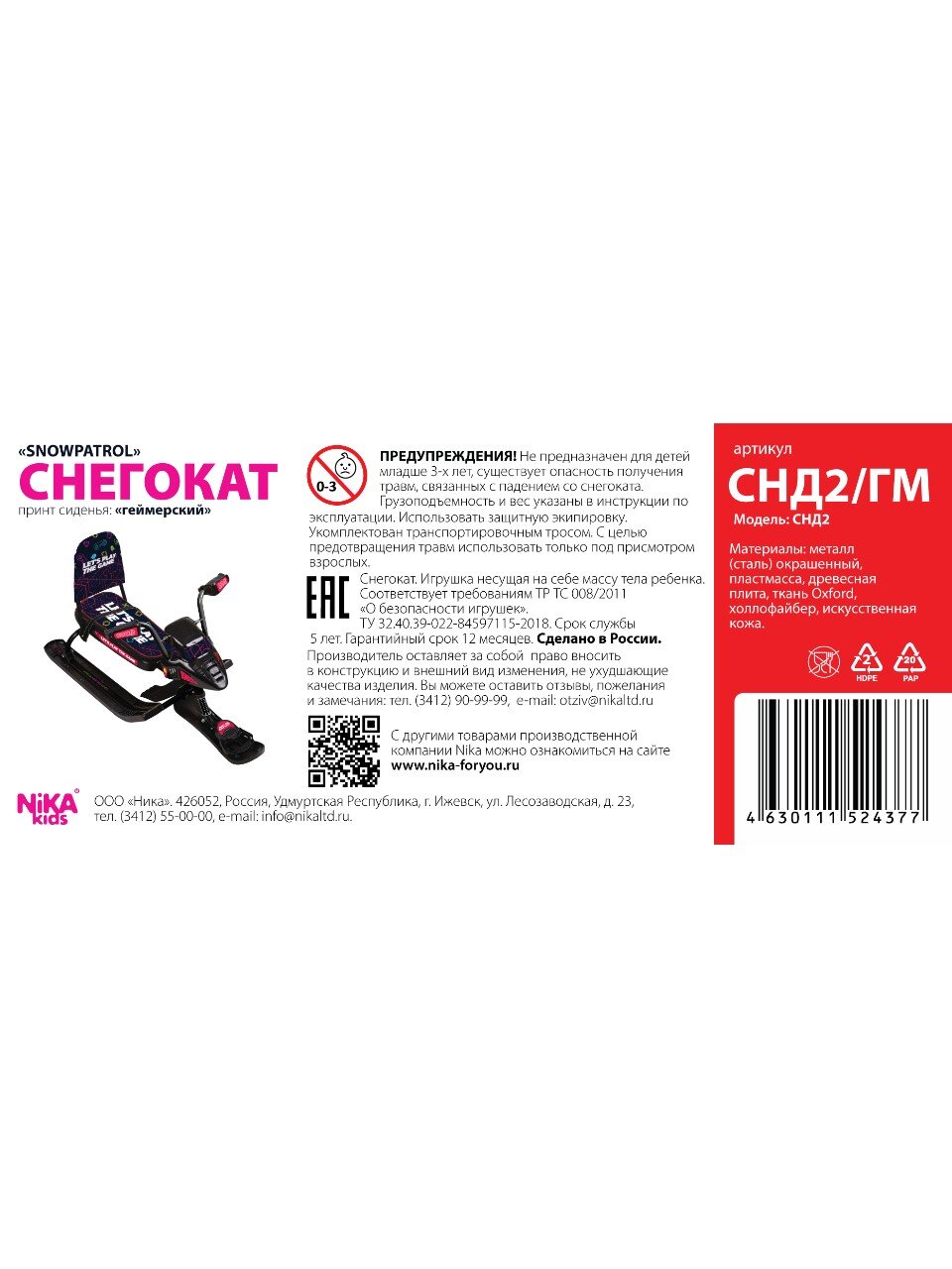 Снегокат Nika, Snowpatrol, СНД2/ГМ, 47 см, черный каркас, велоруль, буксировочный трос, геймерский