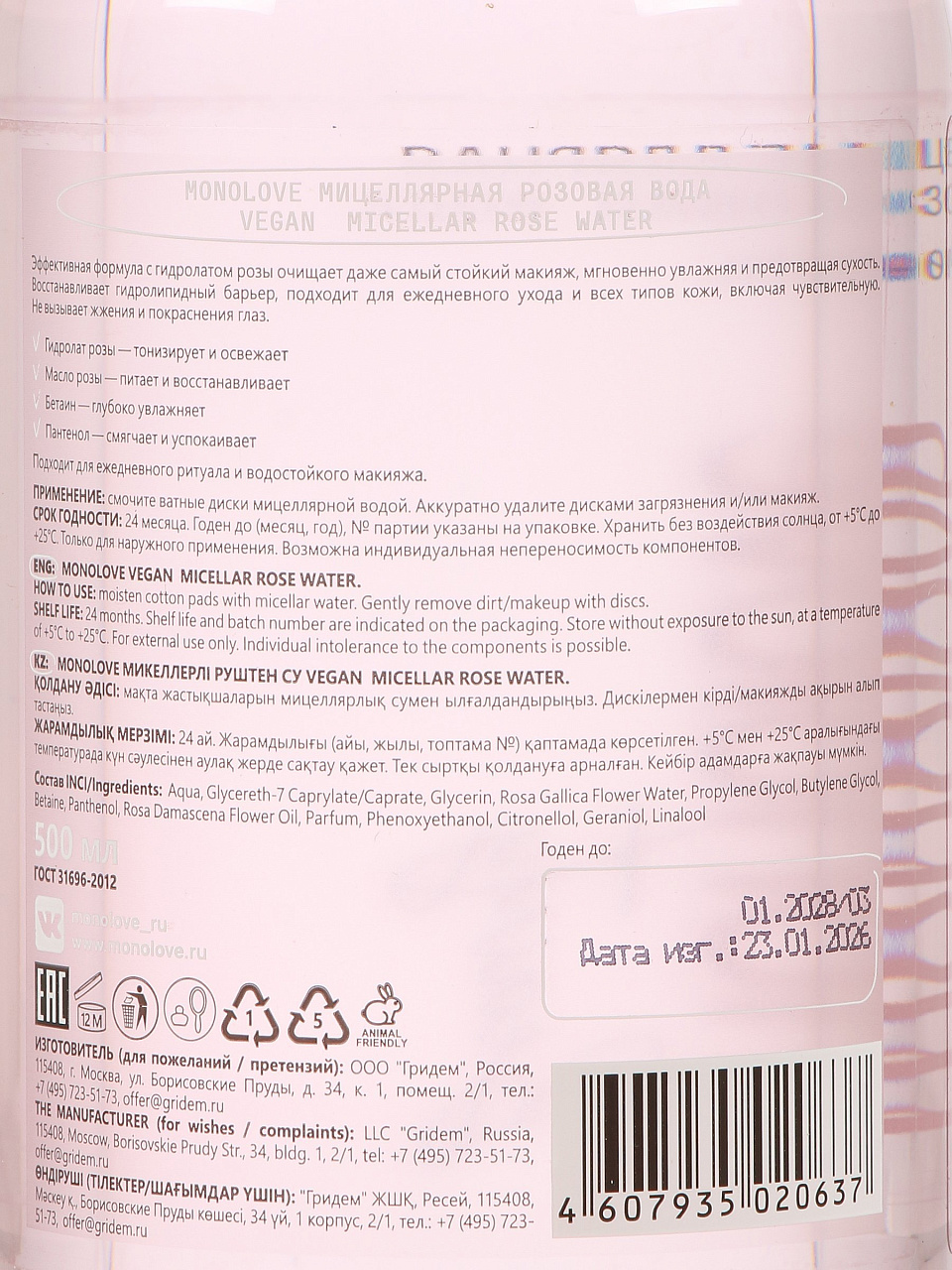 Мицеллярная розовая вода MonoLove bio 500 мл — деликатное очищение кожи без раздражения, подходит для чувствительной кожи, экономичный формат для всей семьи.