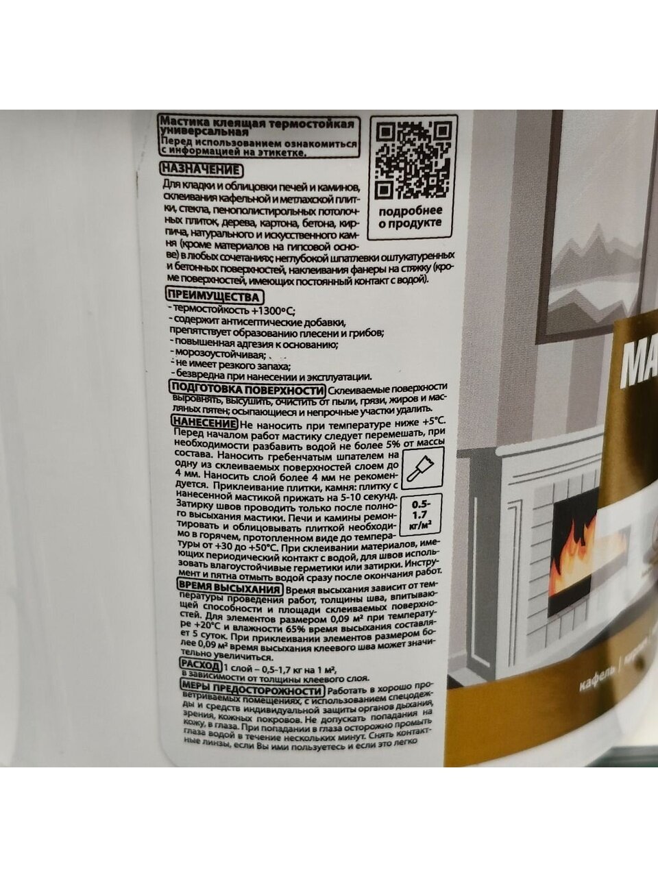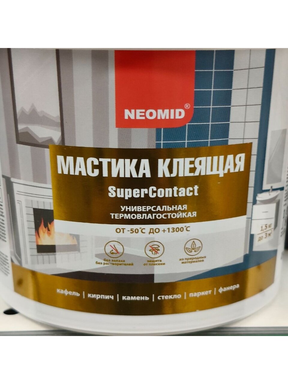 Мастика клеящая универсальная термовлагостойкая (высохший клеевой шов выдерживает температуру от -50°С до +1300°С) «NEOMID» предназначена для кладки и облицовки печей и каминов, склеивания кафельной и метлахской плитки, стекла, пенополистирольных потолочных плиток, дерева, картона, бетона, кирпича, натурального и искусственного камня (кроме материалов на гипсовой основе) в любых сочетаниях, неглубокой шпатлевки оштукатуренных и бетонных поверхностей, наклеивания фанеры на стяжку (кроме поверхностей, имеющих постоянный контакт с водой). При склеивании материалов имеющих периодический контакт с водой, для швов использовать влагоустойчивые герметики или затирки. Можно использовать как затирку. Содержит антисептические добавки. Препятствует образованию плесени и грибов.