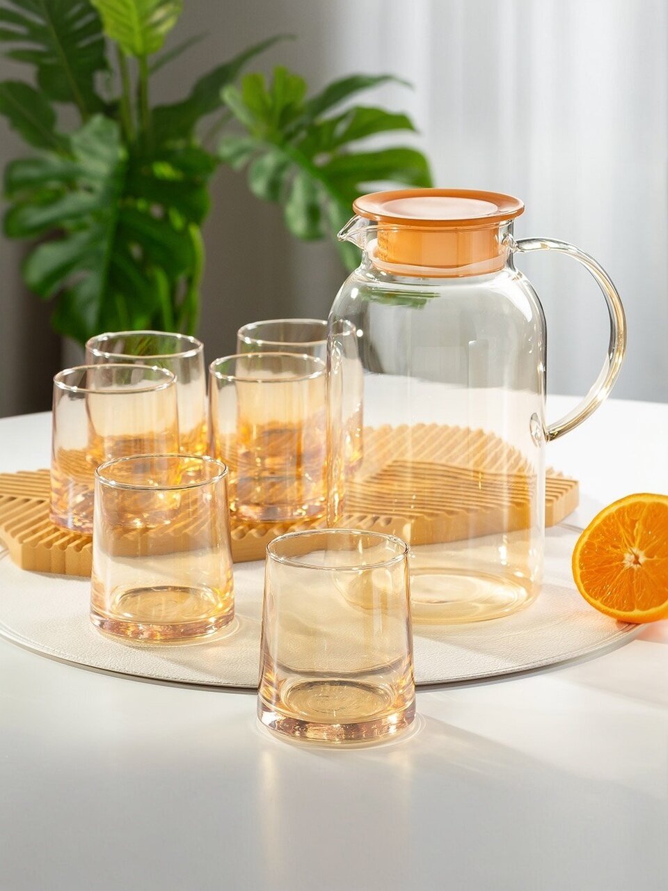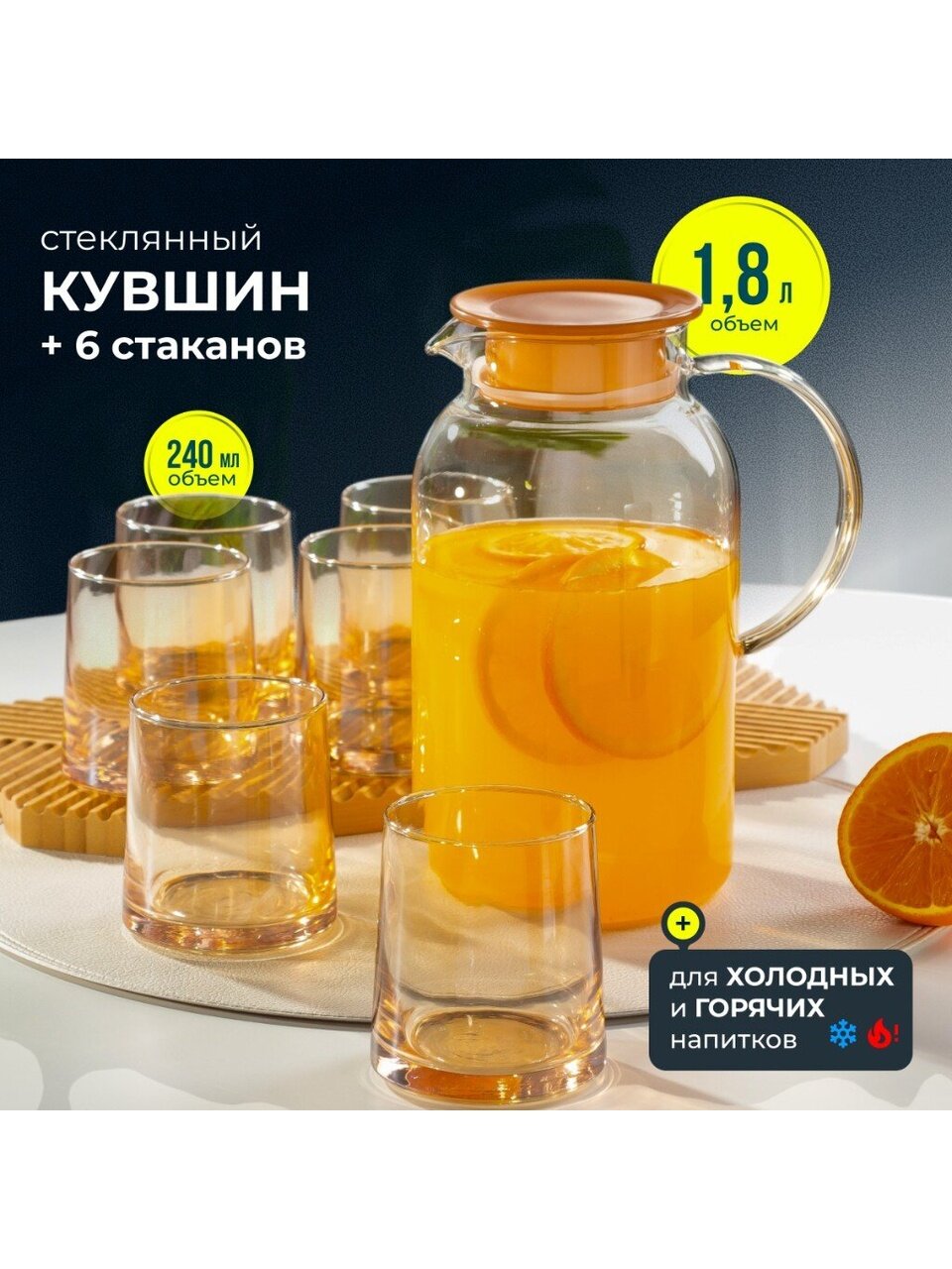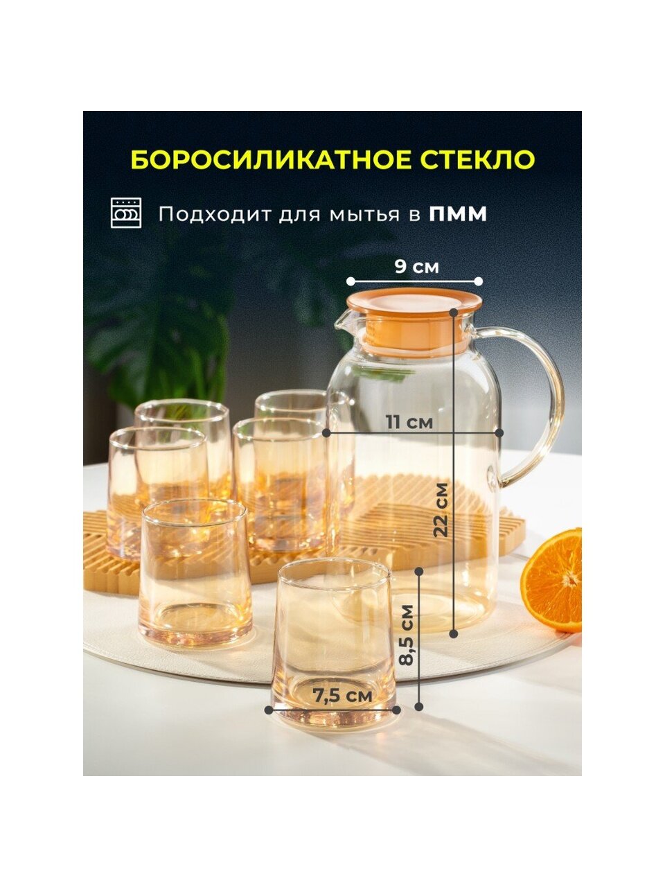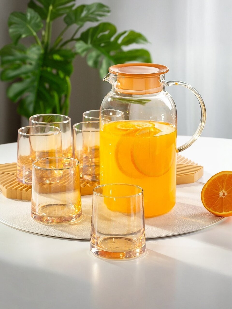 Набор выполнен из боросиликатного стекла, которое славится своей прочностью и устойчивостью к перепадам температуры. Это делает его идеальным выбором как для горячих, так и для холодных напитков. В комплект входит кувшин объемом 1.8 литра с удобной крышкой, а также шесть стаканов емкостью 240 мл каждый. Такая комплектация позволяет наслаждаться любимыми напитками в компании близких и друзей.