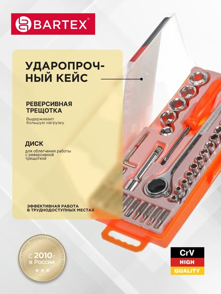 Набор инструментов Bartex выполнен из высококачественной хромованадиевой стали. Сильными сторонами этого материала являются высокая стойкость к ударным нагрузкам и коррозии. Инструменты помещены в стильную сумку, которую удобно брать с собой. Набор отлично подойдет для проведения работ по обслуживанию автотехники, а также для осуществления монтажа и демонтажа резьбовых соединений.