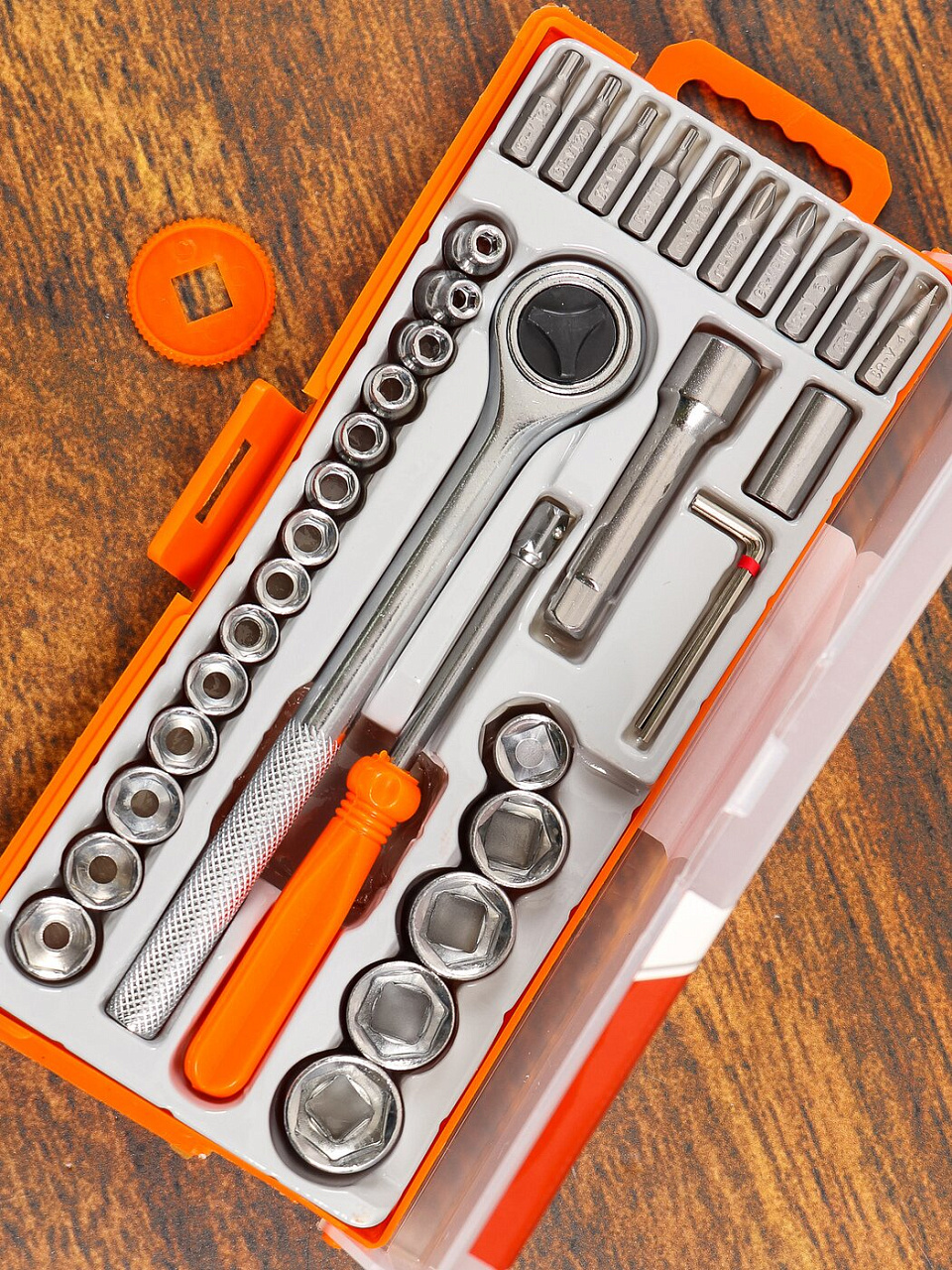 - Диск для облегчения работы с реверсивной трещоткой делает процесс ремонта максимально комфортным.