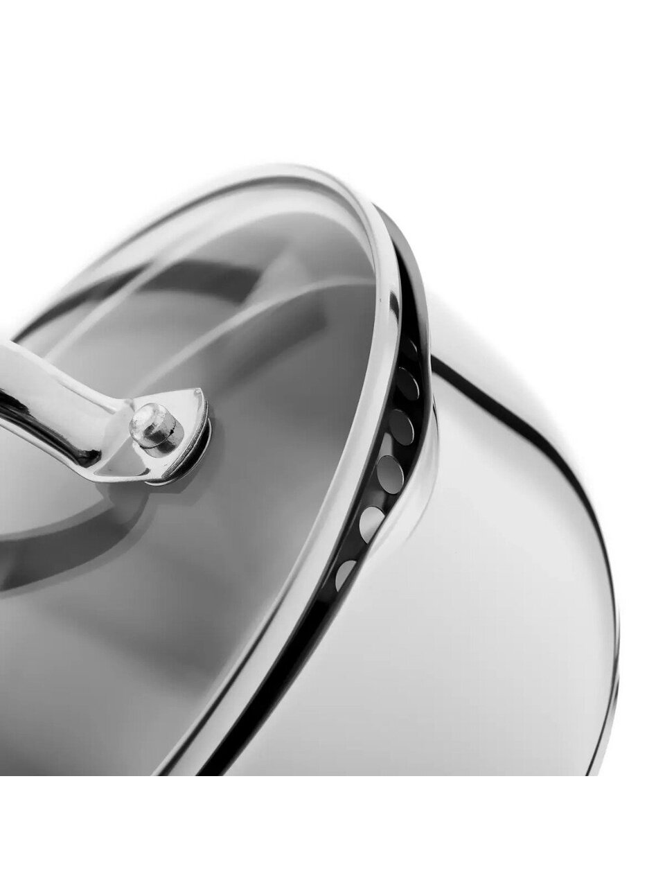 - Практичные размеры: кастрюли 1.8, 2.5, 4.5 л и ковш 1.3 л с прочными стеклянными крышками, подходят для индукционных плит