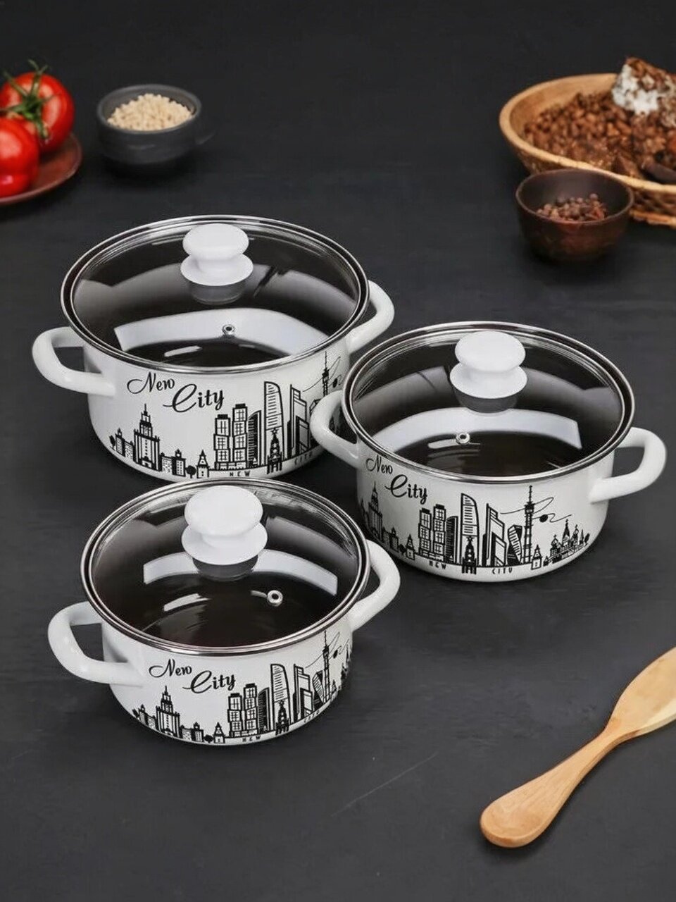 Набор эмалированной посуды на 6 предметов: оптимальный выбор для дома и дачи — три кастрюли 1.5, 2.3 и 3 л, долговечная сталь, выгодная цена.