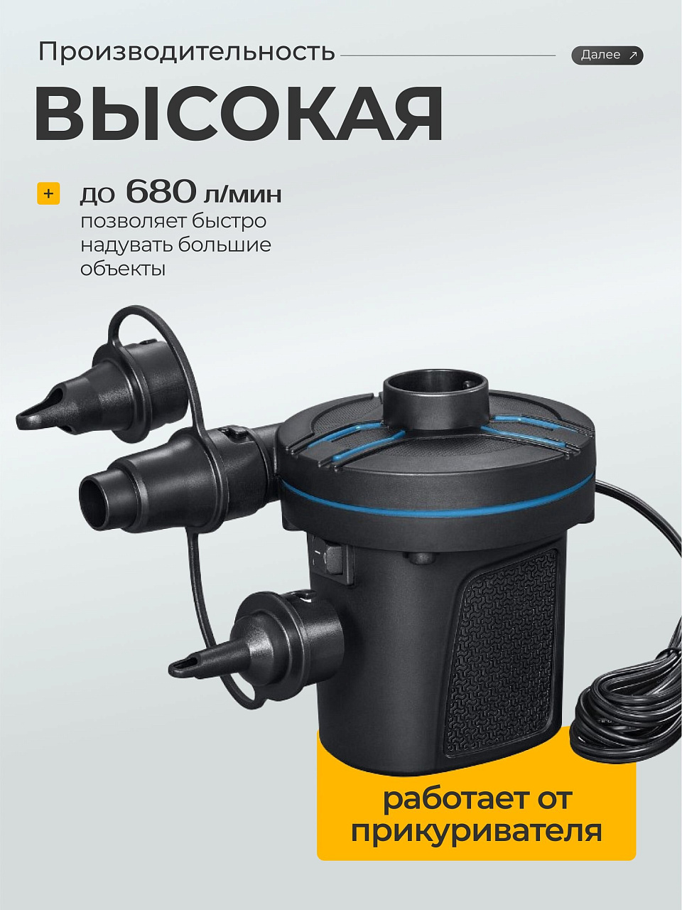 Вы можете приобрести «Насос воздушный электрический, 12 В, 3 насадки, 12 В постоянного тока, Bestway, 62257» и другие товары в нашем интернет-магазине в Обнинске по низким ценам и с бесплатным самовывозом.