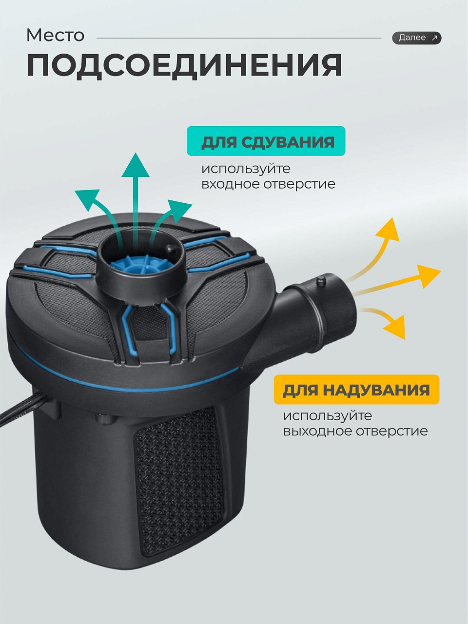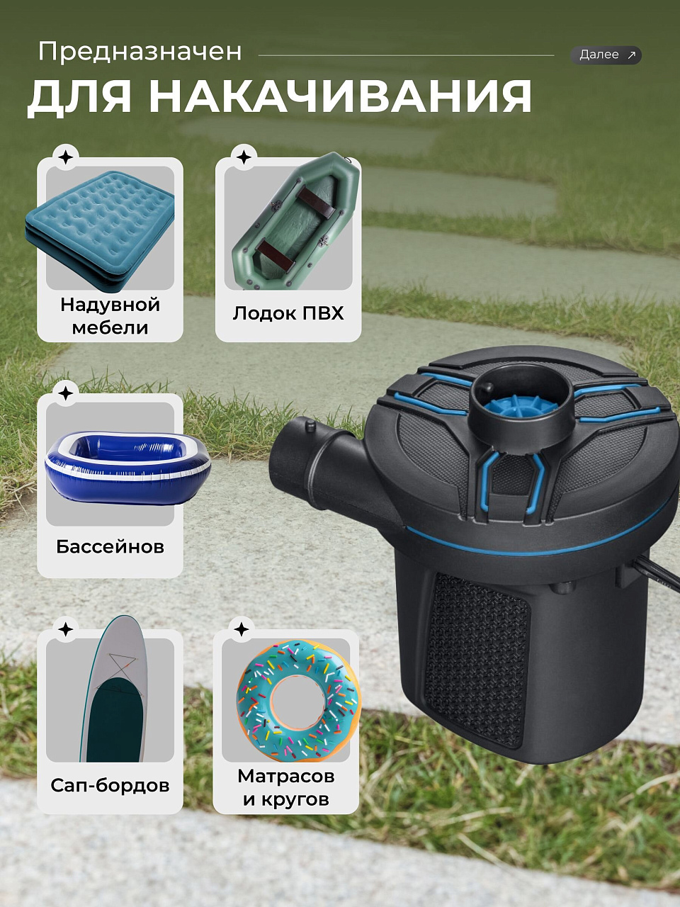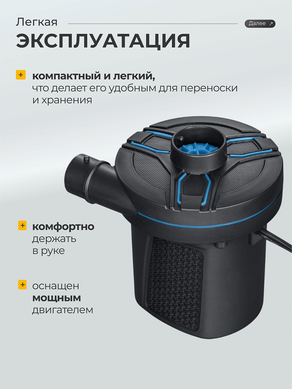 - Оснащен мощным двигателем, который обеспечивает быстрое и эффективное накачивание, сокращая время и усилия, которые Вы тратите на этот процесс.