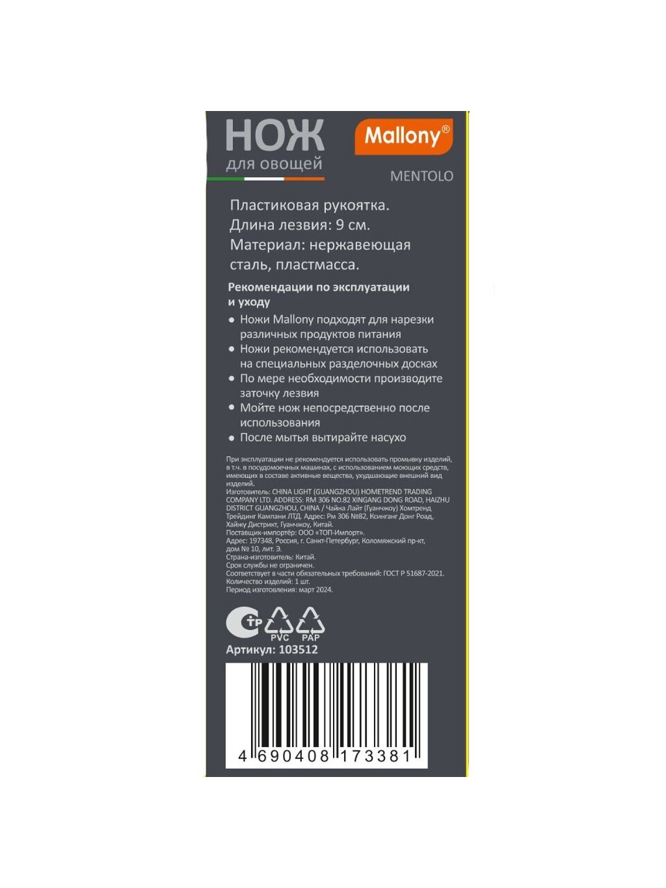 Вы можете приобрести «Нож кухонный Mallony, Mentolo, для овощей, нержавеющая сталь, 9 см, рукоятка пластик, 103512» и другие товары в нашем интернет-магазине в Таганроге по низким ценам и с бесплатным самовывозом.