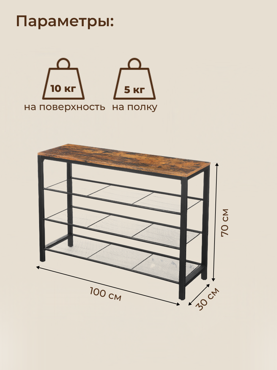 Полка для обуви, ДСП+сталь, 4 секции, 100х30х72 см, с сетчатыми полками, коричнево-черная, Лофт, LBS14BX